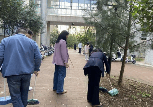 劳动开始后,大家分工协作、默契配合,在指定区域有序逐片清扫。总务部专业人员进行巡回指导,讲解工具安全使用、垃圾分类知识、植物养护常识,解决技术问题。