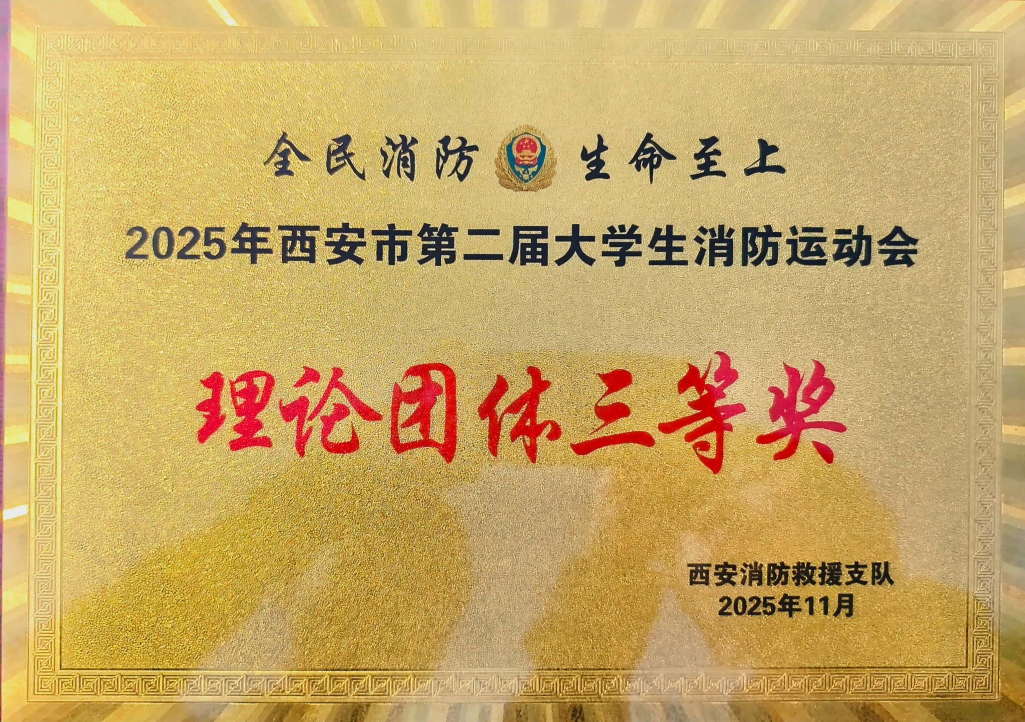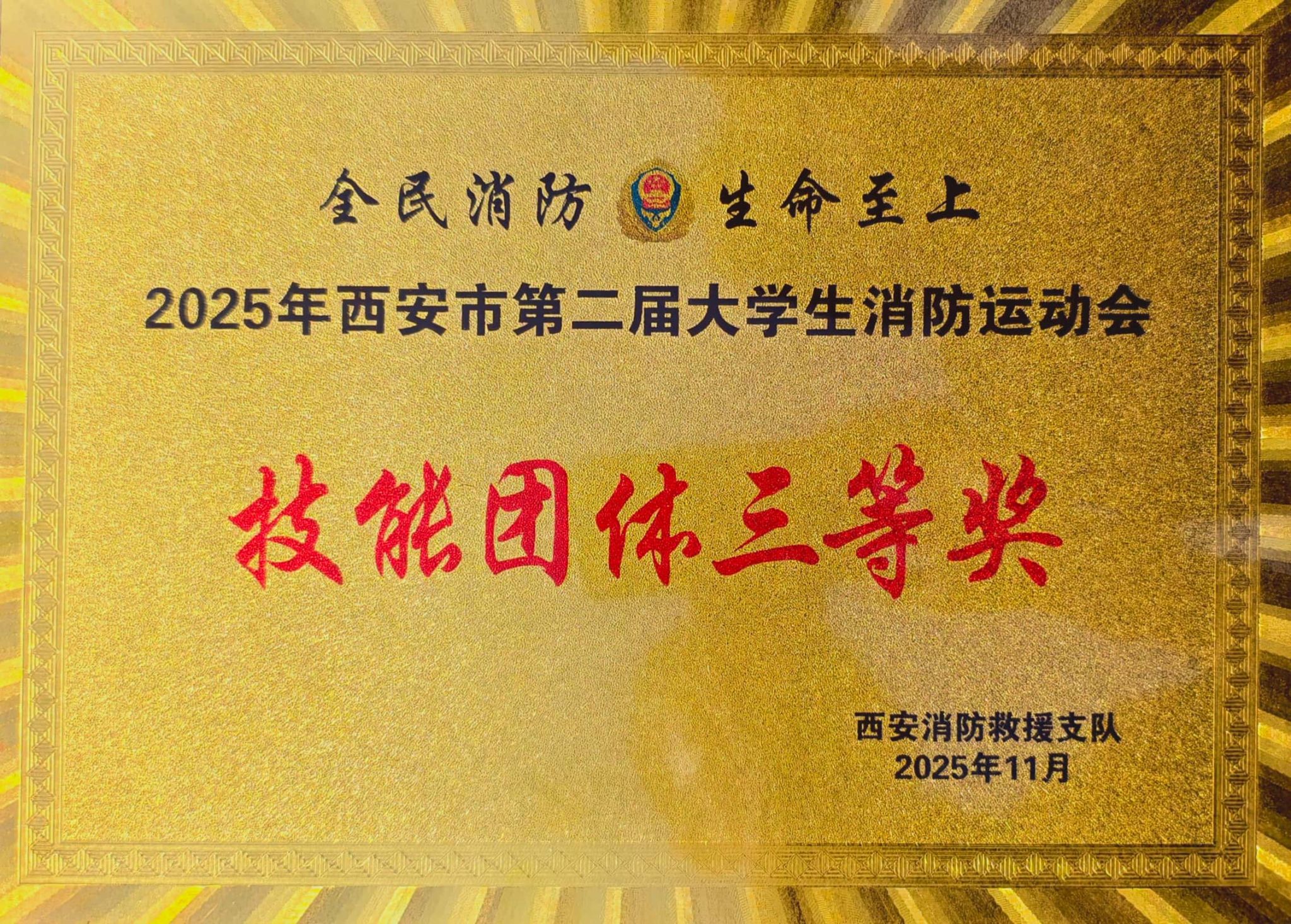 11月15日上午,2025年西安市第二届大学生消防运动会在西北工业大学拉开帷幕。本次赛事由西安市消防救援支队主办,西北工业大学、高新区消防救援大队联合承办,吸引全市39所高校、503名大学生同台竞技。我校学生处与保卫处精心组织,选派9名学生代表参赛并斩获理论团体三等奖、技能团体三等奖两项荣誉。