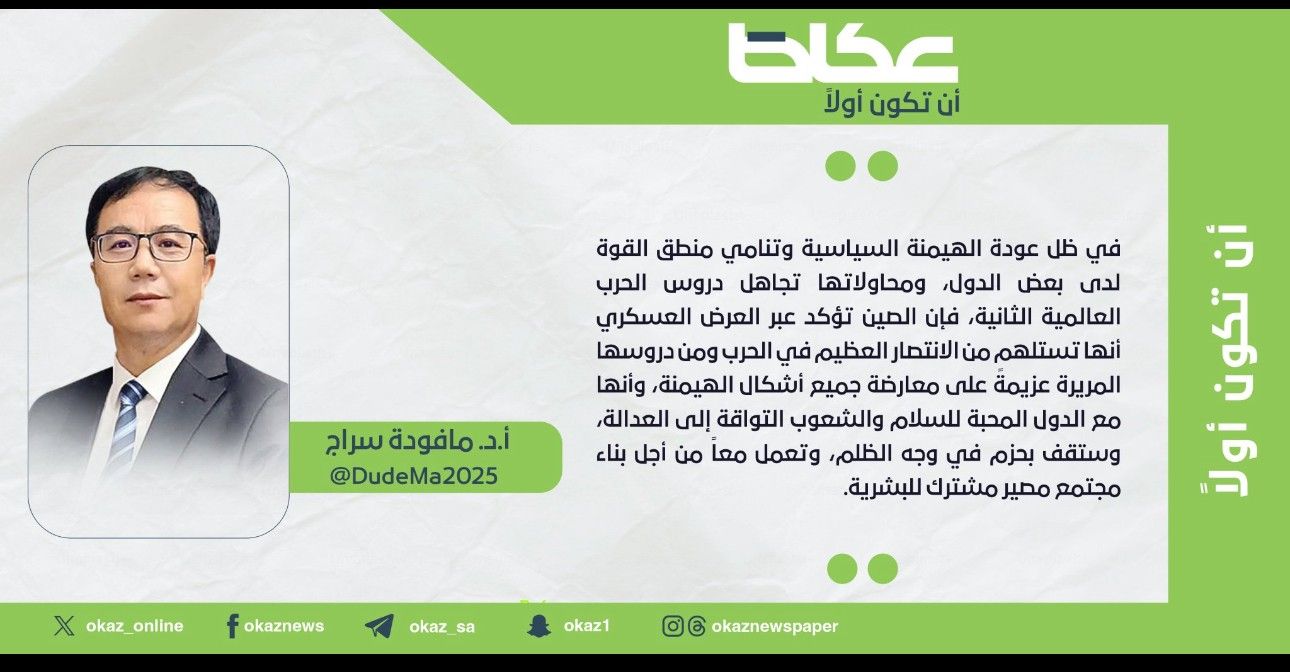 11月16日,沙特阿拉伯最具影响力的媒体之一《欧卡兹报》刊发我校马福德教授撰写的评论文章。文章直面当前部分国家政治霸权主义复辟、强权逻辑蔓延的国际态势,深刻指出一些势力妄图无视二战历史教训的危险倾向,明确阐释中国阅兵式所承载的深层内涵。中国从战争胜利的辉煌与惨痛教训中汲取奋进力量,坚定秉持反对一切形式霸权主义的立场,始终与世界上爱好和平、渴求正义的国家和人民并肩同行,坚决抵制不公正现象,携手共筑人类命运共同体。