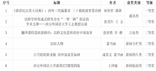 获奖作品中,崔欣哲、潘娇撰写的《新世纪汉英大词典:西外三代编纂者 三十载铸就智慧语桥》获通讯类一等奖。张爱红、王志撰写的《以跨学科集成式研究夯实“一带一路”倡议的学术支撑——西安外国语大学王志教授访谈》获通讯类二等奖,张世胜、许楷撰写的《翻译课程思政新路径:以跨文化思辨讲好中国故事》获言论类二等奖,蒙书函完成的《XISU人物》获新闻专栏类二等奖,成英文、蒙书函共同完成的《白雪皑皑映龙脉 西外窗前景如画》获新闻图片类二等奖,王泽敏编辑的《西安外国语大学报第572期第四版》获新闻版面类二等奖。
