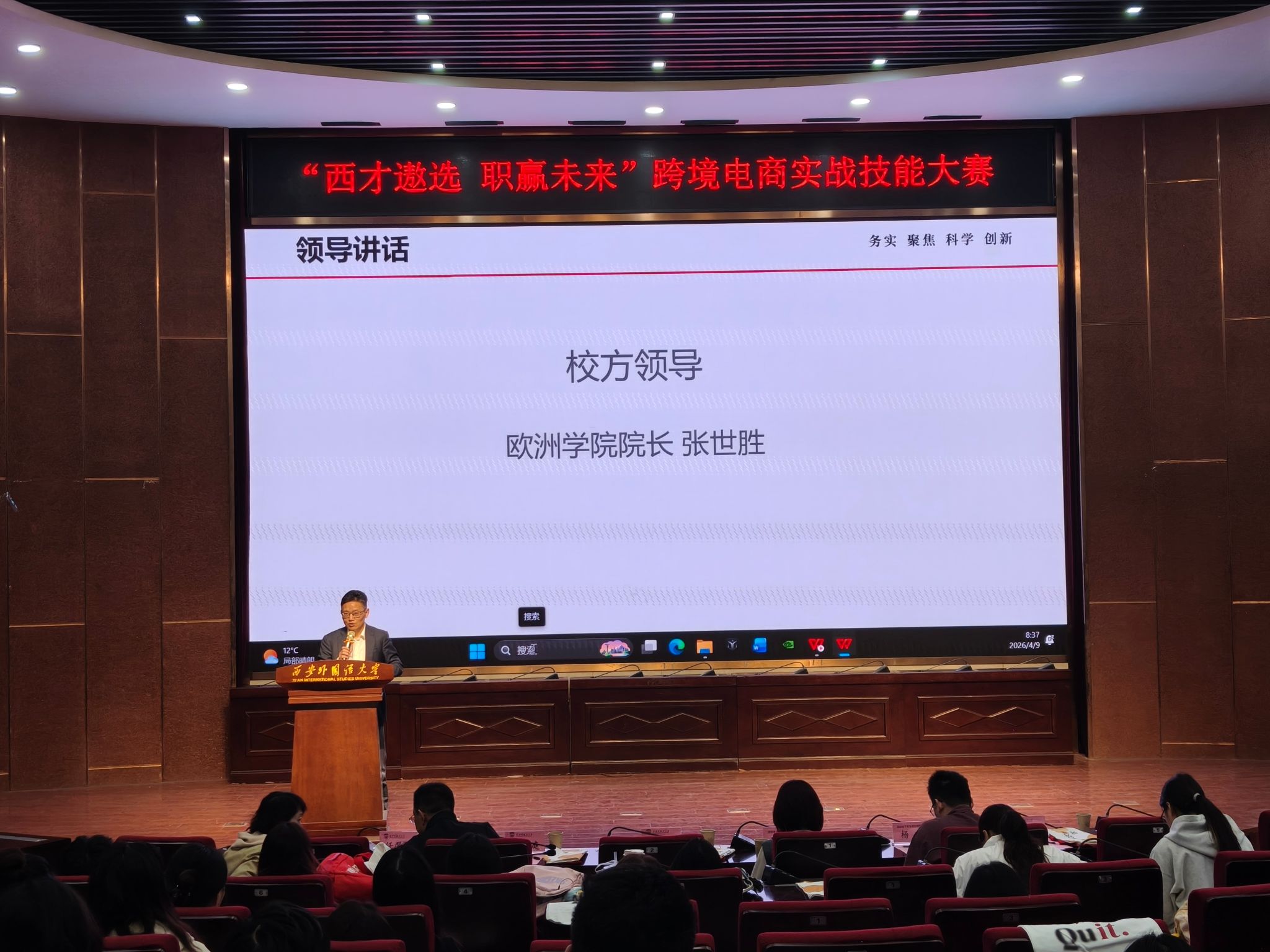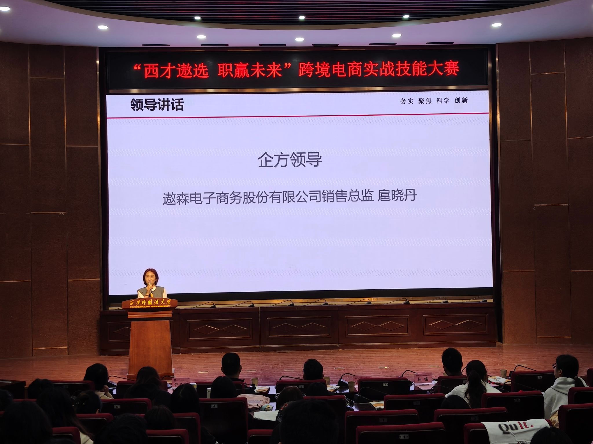 为深化校企合作、提升学生跨境电商实战能力,2026年 4 月 9 日,欧洲学院与遨森电子商务股份有限公司联合举办的 “西才遨选 职赢未来” 跨境电商实战技能大赛开班仪式 ,在长安校区实验楼 A 区模拟联合国实验室(SA105)圆满举行。遨森电商销售总监扈晓丹、营销总监杨啸,欧洲学院院长张世胜、党委书记郭富庭、党委副书记纪彩玲出席活动,学院 2027 届德语专业学生及全体参赛同学参加,仪式由欧洲学院职引未来成长协会指导教师张欢主持。