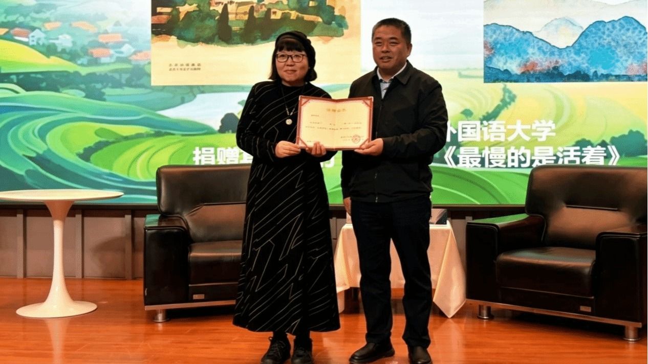 刘振涛代表学校接受了乔叶赠送的著作《宝水》与《最慢的是活着》。这两部作品分别是第十一届茅盾文学奖与第五届鲁迅文学奖的获奖之作,是乔叶文学创作的重要成果,也将成为滋养西外学子精神世界的宝贵财富。