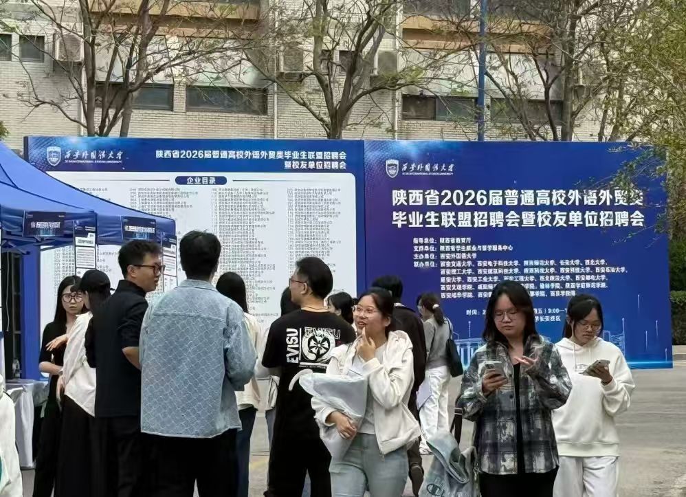 4月10日,我校举办陕西省2026届普通高校外语外贸类毕业生联盟招聘会暨校友单位招聘会。本次招聘会由陕西省教育厅指导,陕西省学生就业与留学服务中心支持,我校主办,全省20余所高校联办,吸引了200余家优质单位参会,为外语外贸类专业毕业生搭建起广阔的就业平台。