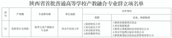 “数智文旅产教融合专业群”聚焦“旅游景区及线路”产业链建设,由西安外国语大学牵头,联合陕西师范大学、西北政法大学、西安欧亚学院、陕西警察学院等高校协同推进,并与陕西省旅游景区协会、西安旅游集团、陕西元景数创科技有限责任公司、西安市地图出版社有限公司、陕旅集团延安商业运营管理有限公司等行业协会和企业共同开展建设。专业群建设将围绕文旅产业数字化、智能化、场景化发展需求,统筹整合高校教育资源与行业企业实践资源,着力打造产教深度融合、校企协同育人的高水平专业群。