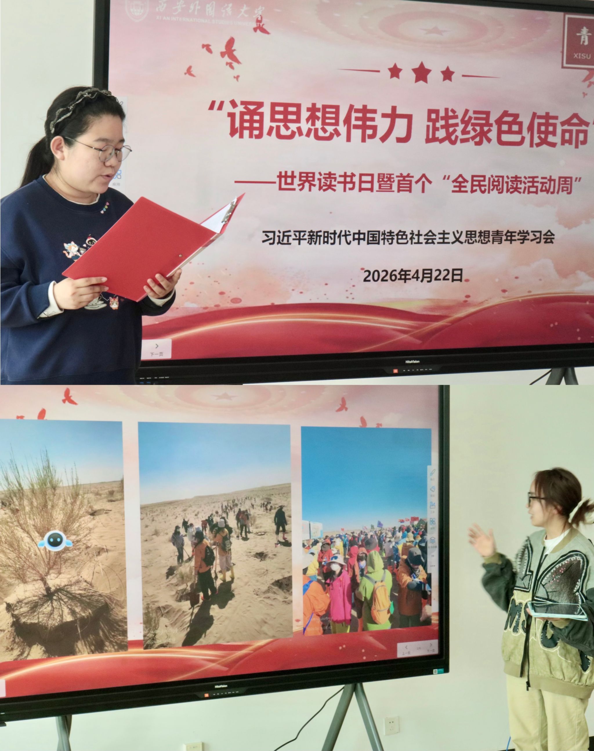4月22日,我校青年学习会在启智楼511室举办专题学习活动。本次活动恰逢2026年4月23日第31个世界读书日来临之际,为积极响应北京外国语大学、外语教学与研究出版社联合发起的“书香中国・语通世界”全国多语种师生朗读《习近平总书记教育重要论述讲义》外文版活动及全国高校朗读倡议,我校师生以多语种朗诵、理论领学、实践分享、交流研讨等形式,将全民阅读与思想引领、绿色实践相结合,引导师生以书香铸魂、以绿色践行使命。