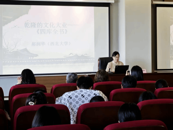 活动特邀西北大学文学院教授、博士生导师、全国《四库全书》研究会理事郝润华作“乾隆的文化大业——《四库全书》”专题讲座。她从编修背景、书籍来源及处理方法、编修过程、编修的成果及意义等方面深入阐释《四库全书》的文化价值,并与中国语言文学学院学生互动交流,现场气氛热烈。
