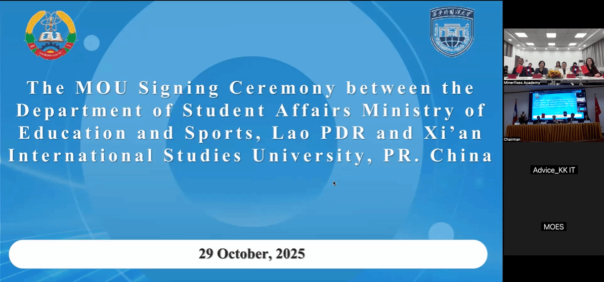 2025年10月29日上午,西安外国语大学与老挝教育和体育部学生事务司以线上线下相结合的方式,成功举行教育合作备忘录签署仪式。老挝教育和体育部学生事务司司长Dockeo Phonthachit女士,规划司、国际合作司、高等教育司相关负责人;西安外国语大学副校长邓滢教授,国际合作与交流处负责人、经济金融学院领导班子及相关人员出席仪式,共同见证这一推动中老教育合作迈向深入的关键时刻。