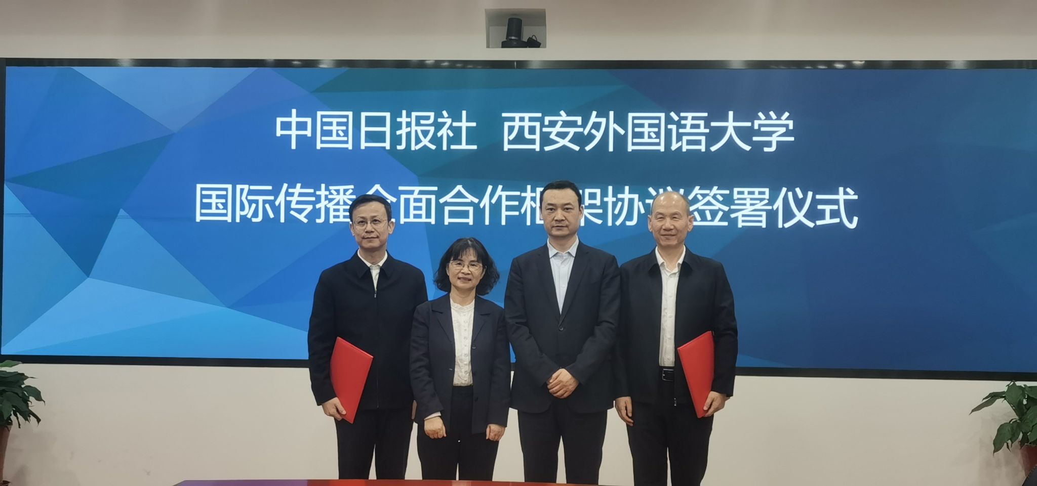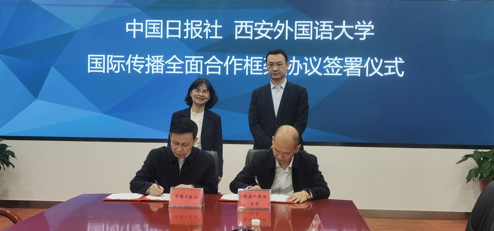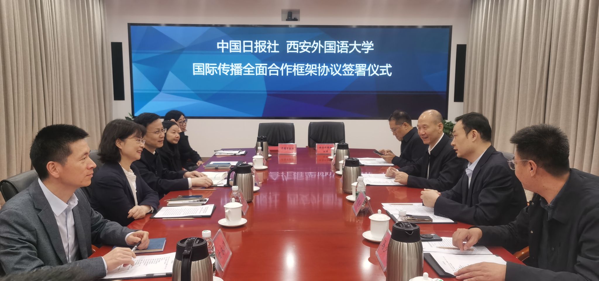 为深入推进我校国际传播工作,2025年10月30日上午,西安外国语大学校长吴耀武、党委副书记王强带队赴北京与中国日报社就加强国际传播能力建设开展座谈并签署国际传播全面合作框架协议。