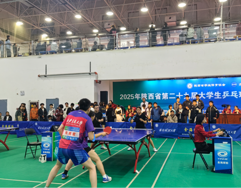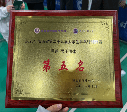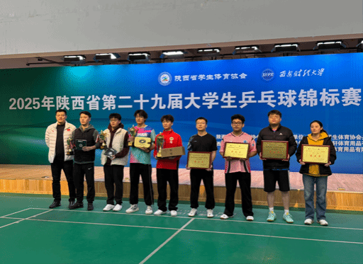近日,第二十九届陕西省大学生乒乓球锦标赛(2025年)圆满落幕。本届赛事规模盛大,共吸引73支代表队参加,其中甲组队伍达32支。混合双打项目竞争尤为激烈,共有67对组合参与角逐。在强手如林的赛场上,我校乒乓球队奋勇拼搏,最终斩获混合双打冠军与男子团体第五名的优异成绩,书写了校队参赛历史上的崭新篇章。