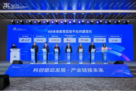 在会议成果签约环节,庞闻院长代表西安外国语大学,与兰州文理学院、西安职业技术学院、渭南师范学院等高校及杭州灵伴科技等企业共同签署“AR未来教育实验平台共建协议”。该平台将整合AR沉浸式交互技术,构建多语言、多场景的智慧教学环境,重点支持外语教学、虚拟旅游实训、跨文化交际等特色课程开发,助力打破传统教育时空限制,提升学生实践能力与创新思维。