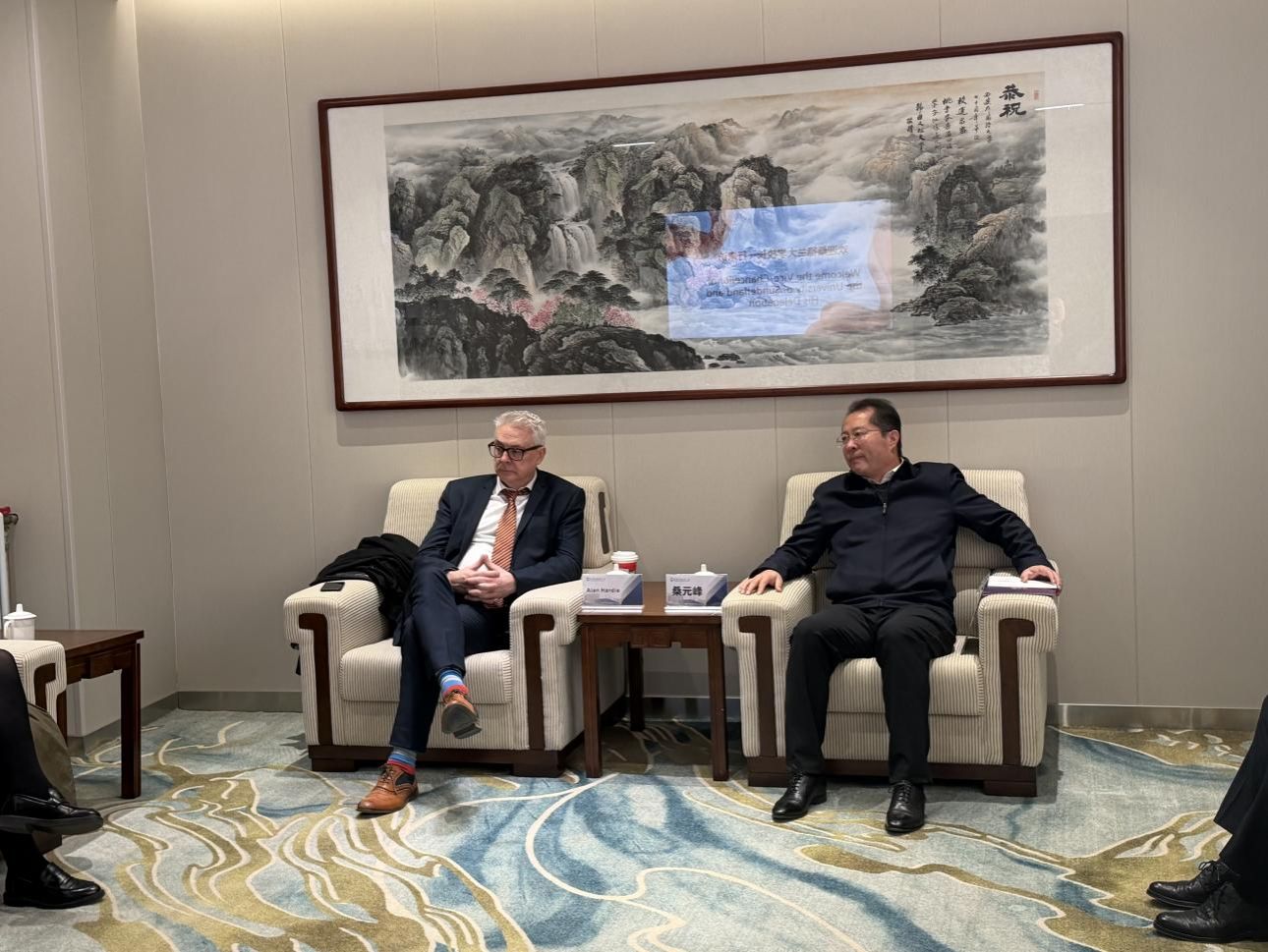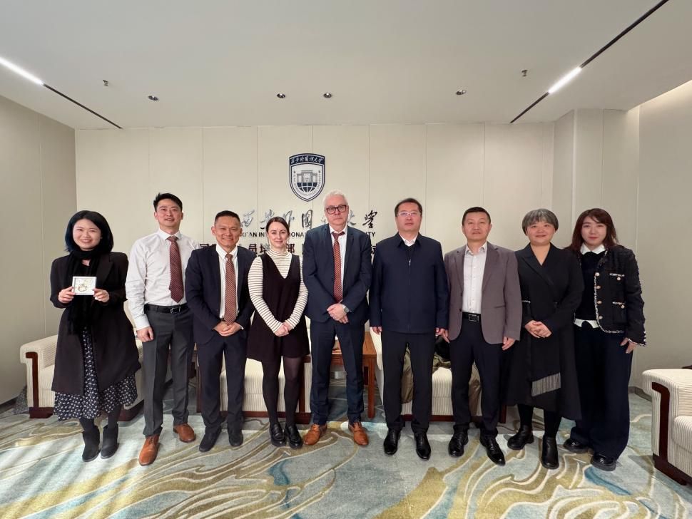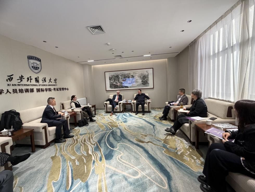 英国桑德兰大学副校长Alan Hardie于11月26日率领高规格代表团访问西安外国语大学,双方于雁塔校区二号教学楼301会议室举行工作会谈。西安外国语大学副校长桑元峰,国际学院负责人及相关人员出席会议,双方围绕媒体与新闻学专业的深度共建、2+2出国留学项目协议的续签、SQA 3+1项目创意艺术设计专业的课程质量以及师资队伍的深度交流等关键议题展开深入磋商,为中英教育合作高质量发展凝聚新共识、擘画新蓝图。