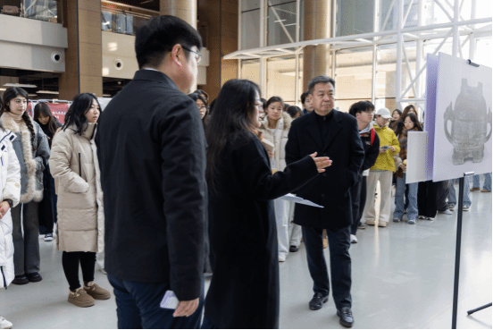 为提升观展体验,展览提供了专人讲解服务,带领师生深入理解文物背后的时代故事。现场设置的互动打卡点也吸引了众多学生参与,使文化传播在校园的社交空间中持续延展。