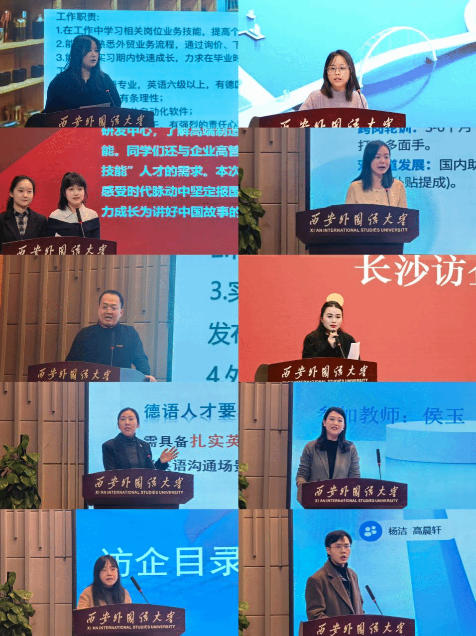 会上,德语专业教师陈晨、法语教师计玉静与侯玉、西班牙语教师史林、葡萄牙语教师陈琛与侯潇英、波兰语教师高晨轩、罗马尼亚语教师陈悦,以及辅导员杨子江、李昶昭,职引未来社团学生田祺燃、王房晶晶等师生代表,依次分享了走访见闻与心得体会。大家围绕走访企业概况、行业发展趋势及人才需求等方面展开介绍,一致强调毕业生除具备扎实的专业口语能力外,还需提升英语交流、跨文化适应以及“语言+技能”复合能力,以更好适应市场需要。