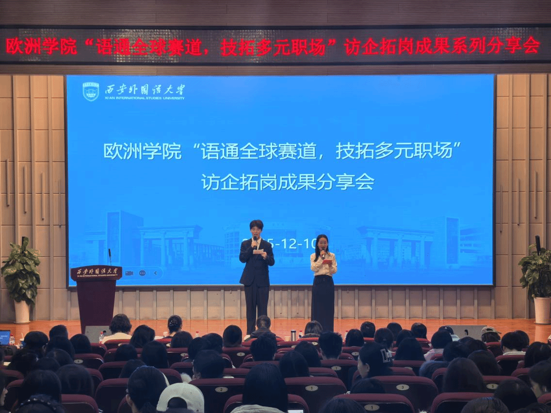 为精准对接企业需求,拓展毕业生就业渠道,12月10日,欧洲学院在JA111报告厅举办本学期师生访企拓岗成果分享会。副校长邓滢出席会议,学院领导班子、全体教师、辅导员、行政人员及本硕学生代表共同参加。会议由欧洲学院学生潘阳、隋建崠主持。