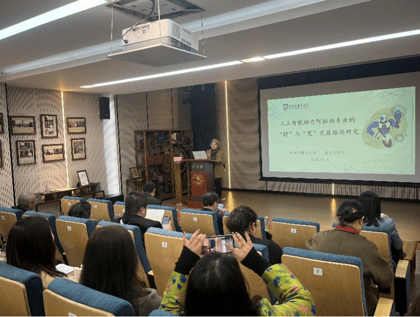 作为此次学术研讨会的重要环节,我校唐雪梅教授发表了题为《人工智能助力阿拉伯语专业的“精”与“宽”发展路径研究》的主旨发言。唐教授结合多年阿拉伯语教学实践经验,深入分析了人工智能技术的前沿应用,系统阐述了“精专业”与“宽领域”协同发展的理念。所谓“精”,即深耕阿拉伯语语言文学的核心素养,夯实专业基础;“宽”,则是依托人工智能技术的赋能,拓展跨学科的应用场景与复合型人才培养维度,为阿拉伯语专业应对时代变革、培养适应国家战略需求的高素质人才提供实践思路。