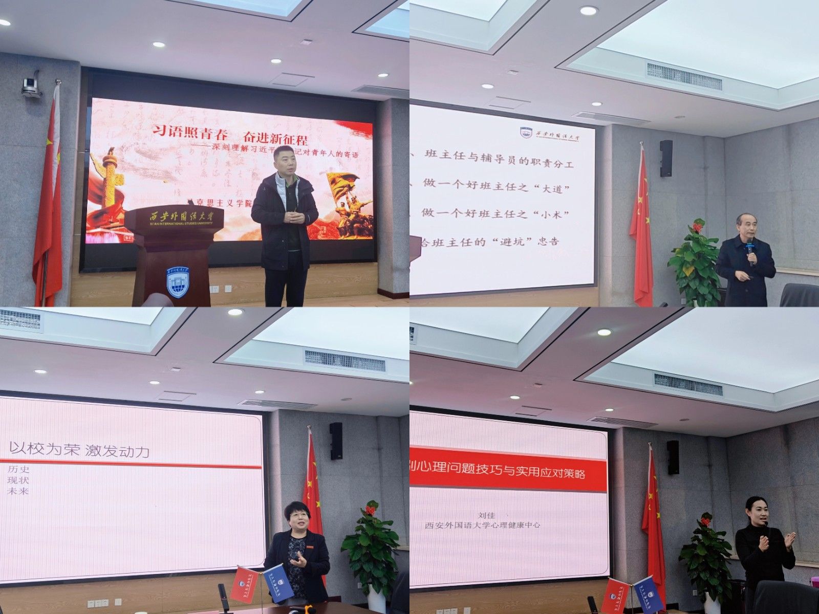 此次培训分为四场专题讲座。第一讲邀请马克思主义学院许涛博士以《习语照青春 奋进新征程》为主题,帮助班主任精准把握青年学生思想特点,夯实育人理论根基。第二讲邀请商学院周龙教授围绕《做学生成长的“领航人”——班主任工作的“道”与“术”》,分享班级管理、学风建设等班级管理实操经验,为班主任提供了可借鉴可参考的工作路径。第三讲由旅游学院·人工智能学院杨红英教授以《亦师亦友 共同成长》为主题,结合自身经验,让班主任深刻理解“育人先育心”的内涵。第四讲由学工部心理健康中心刘佳老师带来《识别心理问题技巧与实用应对策略》专题培训,她用丰富的工作案例帮助参训班主任掌握如何提升心理健康教育与危机应对能力。