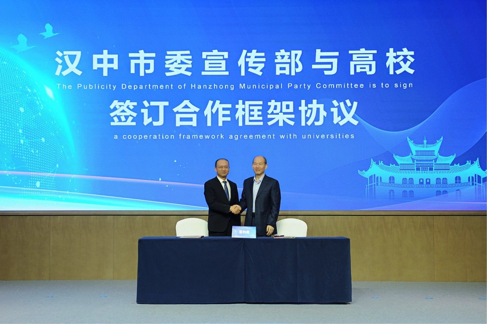 活动现场,与会领导共同为“汉中市国际传播中心”揭牌。汉中市委宣传部分别与包括我校的五所高校签订合作框架协议。签约各方将携手整合优势资源,共同推动汉中市国际传播中心的协同建设与发展。