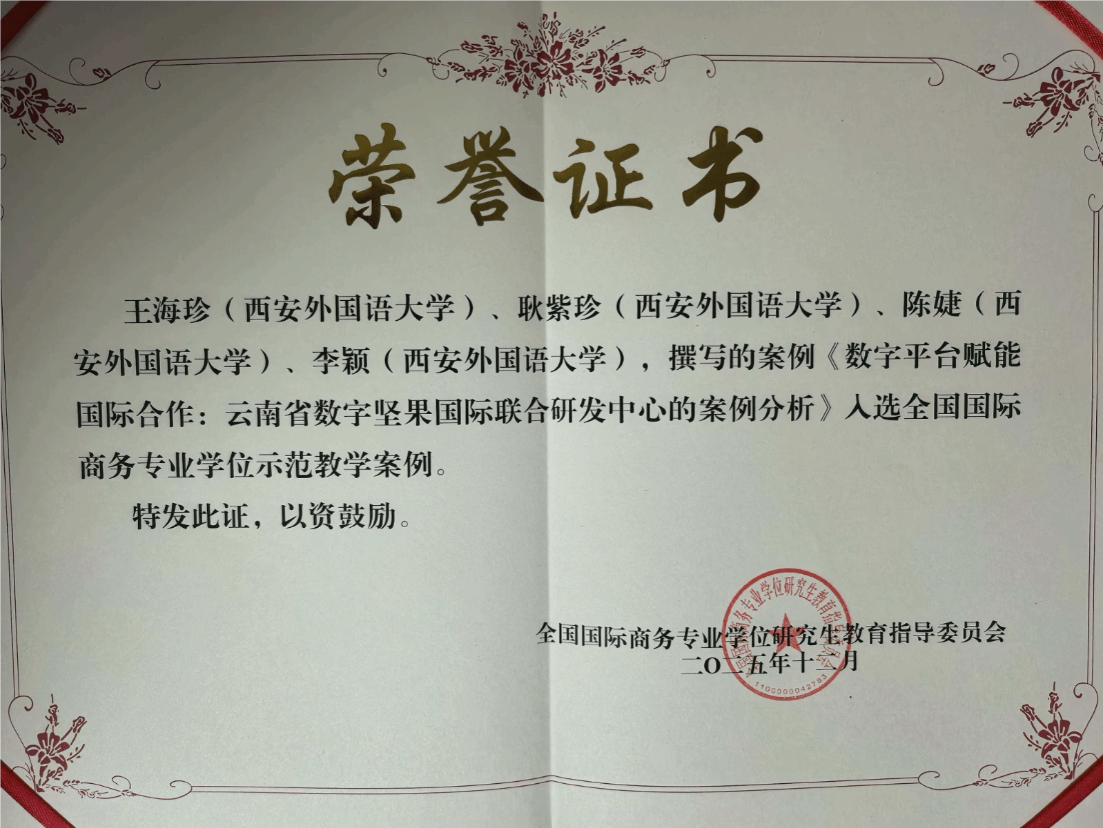 王海珍团队开发的原创案例《数字平台赋能国际合作:云南省数字坚果国际联合研发中心的案例分析》,经教指委组织专家评审,入选全国国际商务硕士专业学位示范教学案例,并获推荐进入中国专业学位案例中心案例库。该案例是国际商务学位点教师深入企业调研、开发一手教学案例的重要成果,体现我校在国际商务专业学位教育中的实践探索力度,提升在全国国际商务专业学位培养中的影响力,对专业硕士点的教学与建设具有积极示范作用。