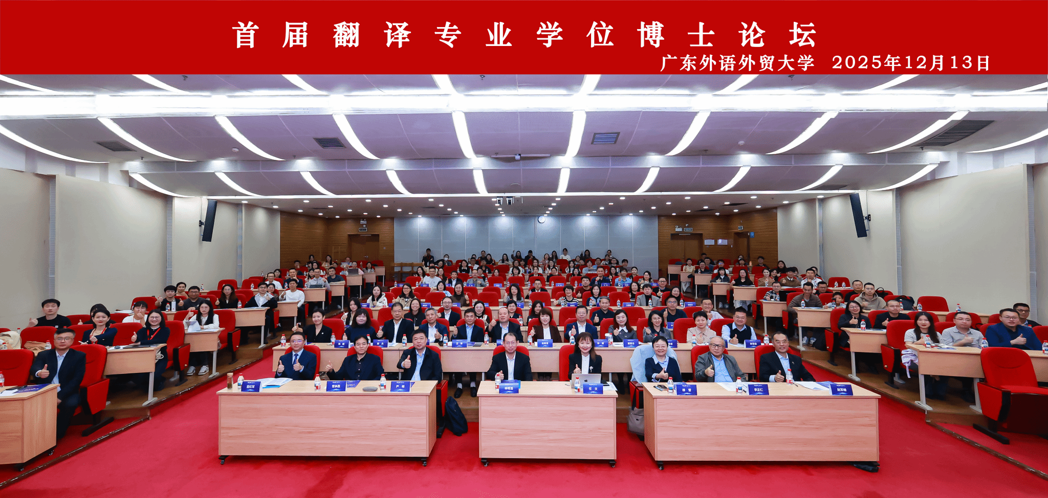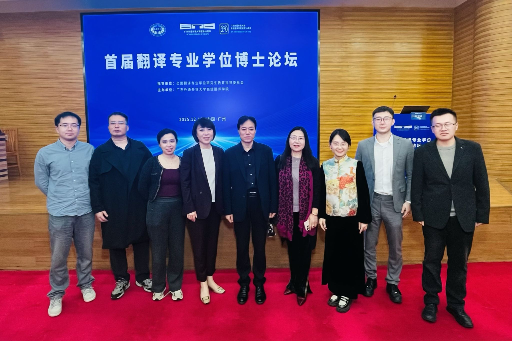 2025年12月13日,首届翻译专业学位博士论坛在广东外语外贸大学召开。全国翻译专业学位研究生教育指导委员会委员、我校DTI导师党争胜教授,高级翻译学院副院长(主持行政工作)赵毅慧,教师代表杨晓华教授及六名DTI博士生参会,共襄翻译学术盛宴。