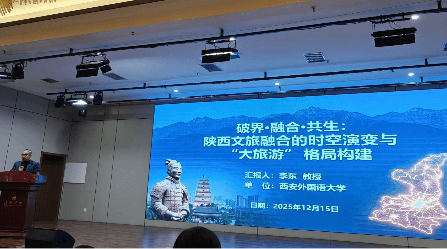 本次会议旨在深入分析陕西旅游经济发展现状与趋势,探讨行业应对策略,并对在旅游创新方面作出突出贡献的青年人才进行表彰。会上,李东教授应邀作了题为《破界·融合·共生:陕西文旅融合的时空演变与“大旅游”格局构建》的主旨报告。报告从时空维度系统梳理了陕西文旅融合发展的时空演化特征,提出了陕西省构建“大旅游”格局的理论框架与实践路径,引发了与会嘉宾的广泛关注与热烈讨论。