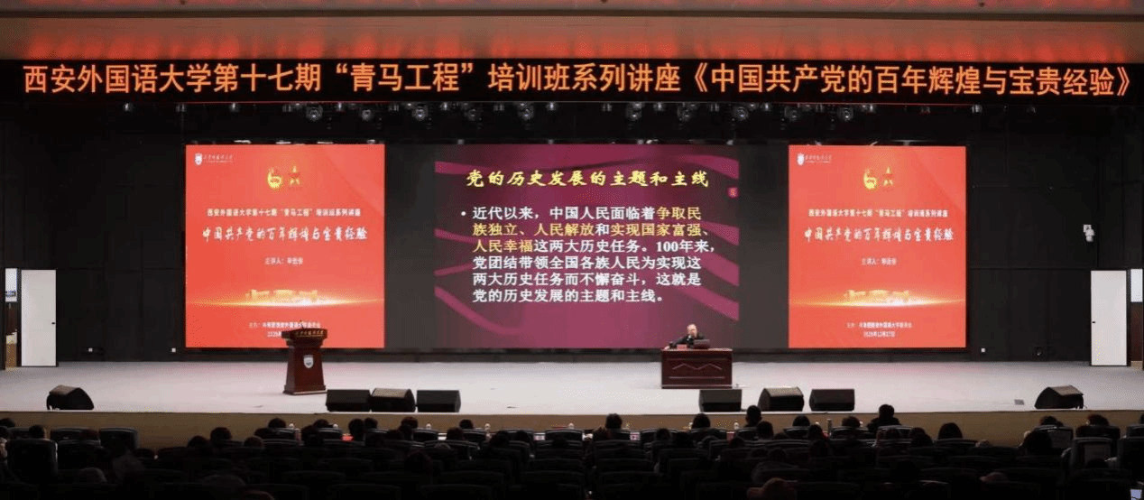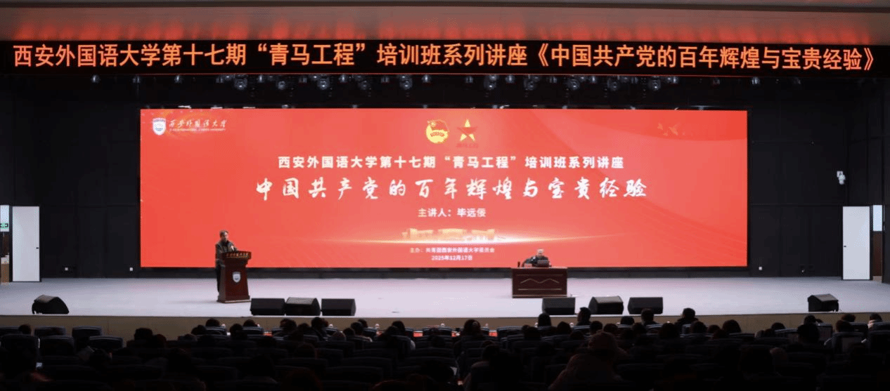 为深入学习党的百年奋斗重大成就和历史经验,扎实推进“青年马克思主义者培养工程”(青马工程)建设,12月17日,我校第十七期“青马工程”培训班专题讲座在长安校区启智楼报告厅顺利举办。中共陕西省委党校二级教授、延安精神研究团队首席专家毕远佞受邀主讲,以“中国共产党的百年辉煌与宝贵经验”为题,为全体青马学员带来了一堂深刻的思想淬炼课。校党委委员、副校长李京昊,学工部、校团委主要负责人,各二级学院党委副书记、辅导员,青马工程学员及各院学生代表共计千余人参加学习。讲座由李京昊主持。