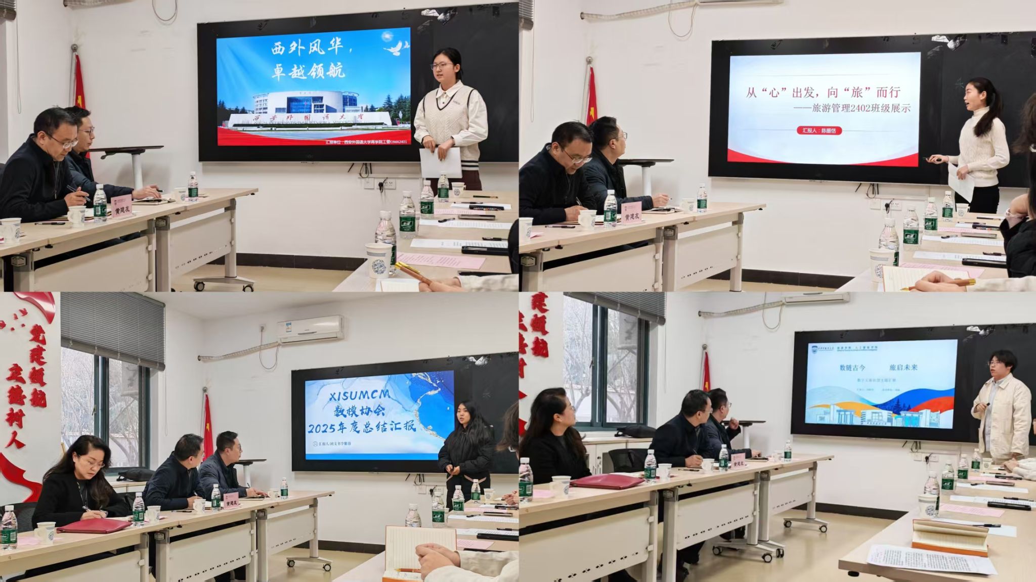 会议伊始,工管CIMA2401班学生干部张泊雅、旅游管理2402班学生干部陈墨恬分别围绕《西外风华·卓越领航》《从“心”出发,向“旅”而行》开展主题班会。随后,数学建模社团学生代表李紫蓉、数字文旅社团学生代表刘柯华依次汇报社团发展情况。他们介绍了社团的组织架构、特色活动开展以及取得的成绩,并结合社团发展实际,提出了未来发展构想。