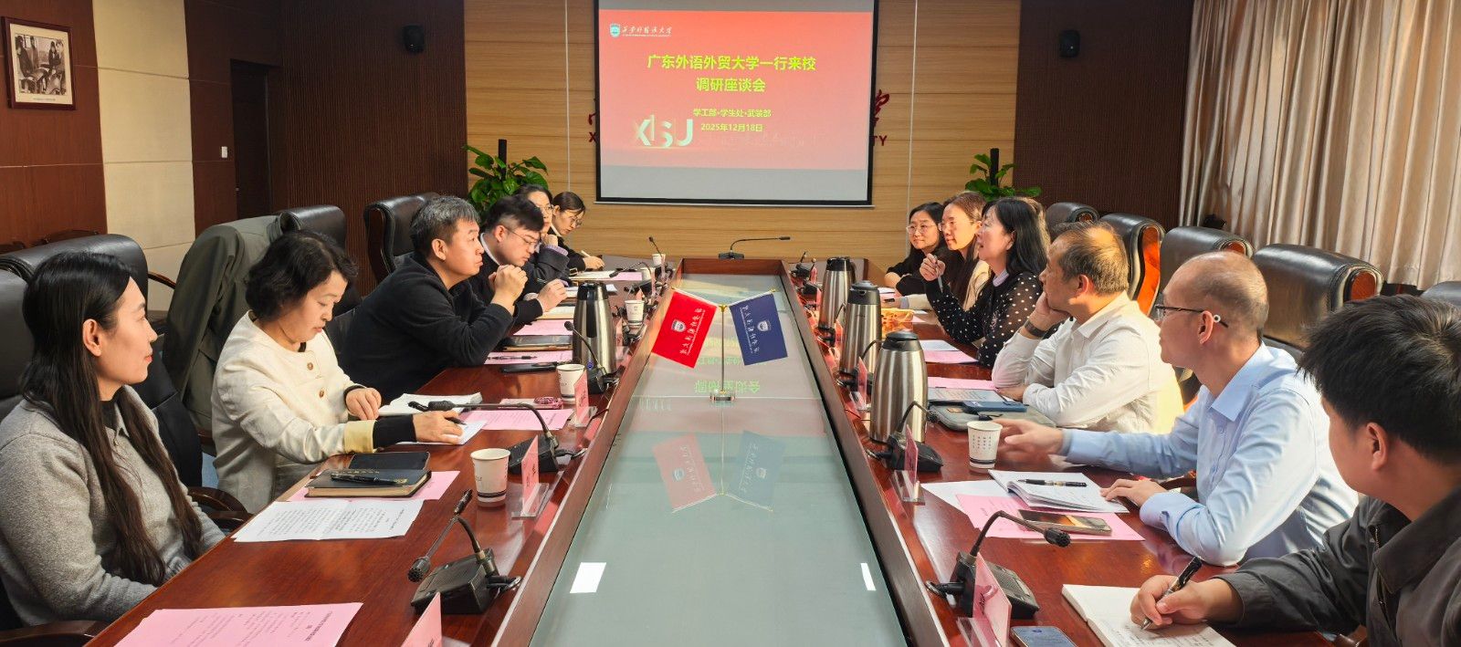 12月18日下午,广东外语外贸大学党委副书记葛小月带队来校调研,副校长李京昊、相关职能部门负责人、二级学院党委副书记及辅导员代表参加座谈。