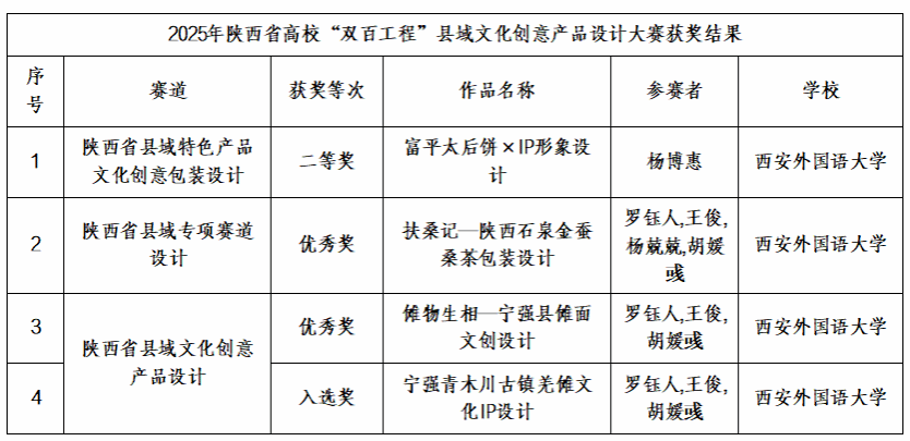 近日,中共陕西省委教育工作委员会、陕西省教科文卫体工会委员会下发《关于对2025年陕西省高校“双百工程”县域文化创意产品设计大赛结果的通报》。我校艺术学院学生作品共获得各赛道二等奖1项,优秀奖2项,入选奖1项。