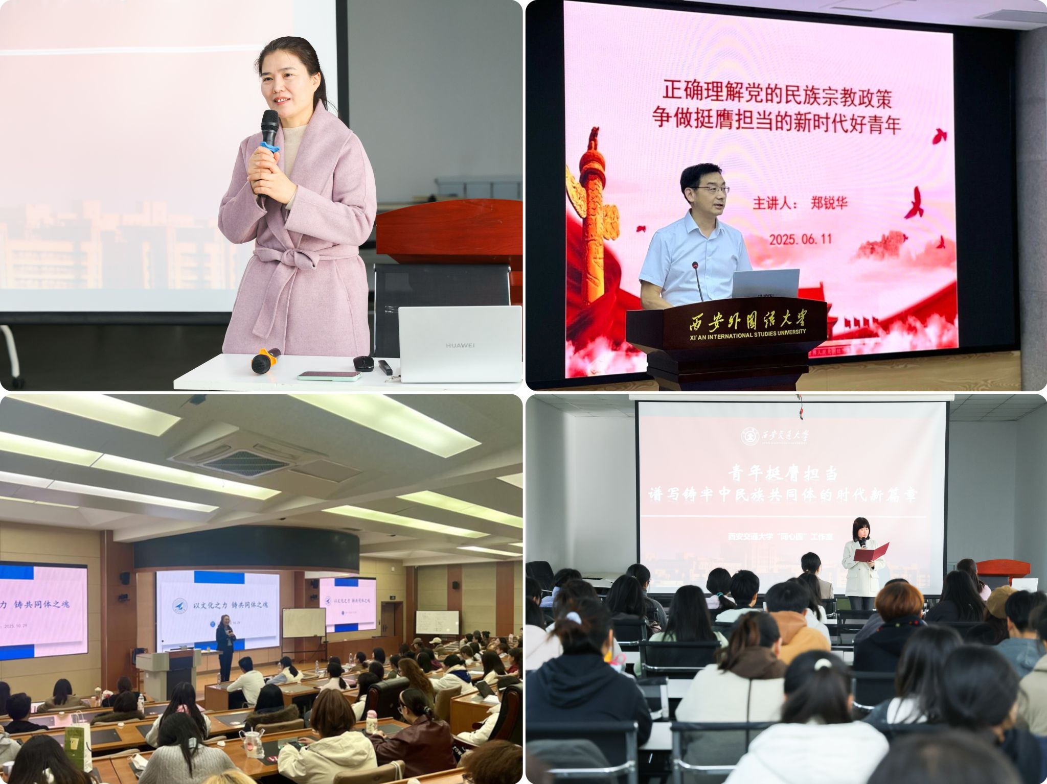 思想铸魂,筑牢同心向党的信仰根基。学校坚持将思想引领置于首位,不断夯实共同奋斗的思想基础。一方面,通过邀请全国民族团结进步模范个人库来西・依布拉音教授、西北工业大学蒲瑶教授等知名专家举办专题报告,深化理论武装;校党委委员郑锐华围绕民族宗教政策开展6场专题培训,精准解读政策内涵,增强学生责任意识和筑牢思想防线。全年组织召开20场少数民族学生座谈会,精准回应学生关切。创新开展“培根育魂 石榴花开”系列主题活动,涵盖经典诵读、多语朗诵、征文分享等多元形式,并组织学生赴红色教育基地开展沉浸式研学,引导学生厚植家国情怀,自觉将个人理想融入民族复兴伟业。