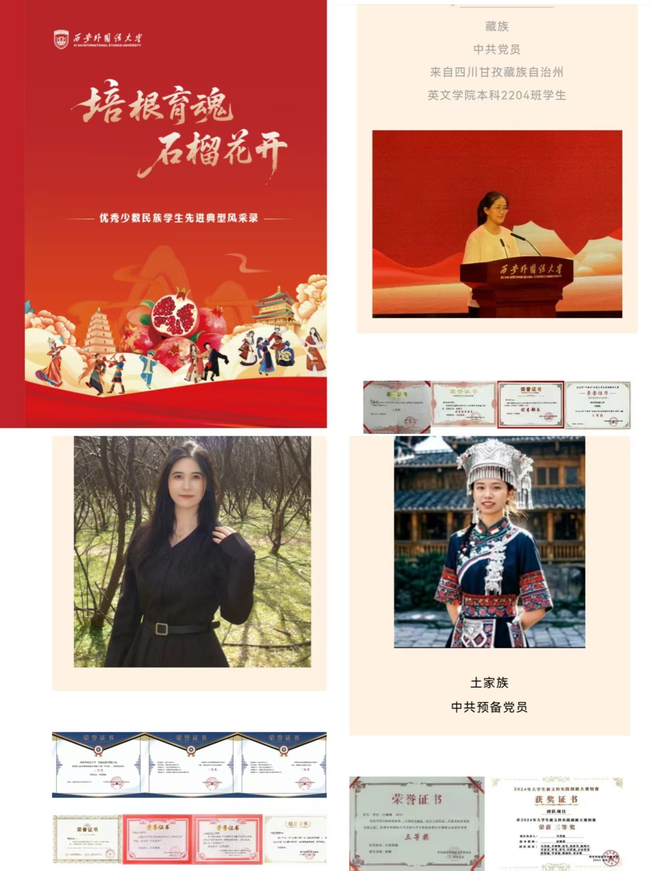 榜样示范,汇聚见贤思齐的前行力量。学校注重挖掘和宣传先进典型的示范作用。收集编撰80余名优秀少数民族学生先进典型风采录,其中既有优秀退伍学生的热血担当,也有学生骨干的责任坚守,生动展现了少数民族学子的青春风貌。通过广泛宣传这些身边人、身边事,让榜样故事可感可学,在校园内营造出见贤思齐、争先创优的浓厚氛围,激励广大少数民族学生奋发向上、逐梦前行。