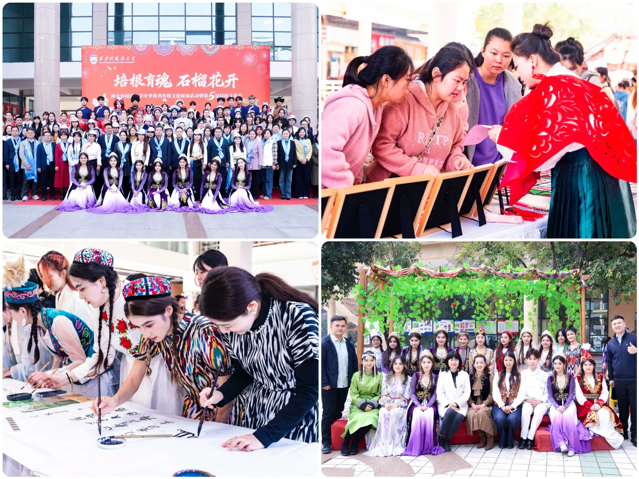 文化沁润,奏响美美与共的交响乐章。学校着力打造特色文化育人品牌,以文聚力、以文化人。成功举办第五届“培根育魂,石榴花开”民族文化节,通过民族文化展、中华传统文化体验、艺术展演等丰富形式,生动呈现中华文化的绚丽多彩与各民族的共生共融的深厚底蕴,活动影响力广泛,参与学生2000余人,获《陕西日报》《华商头条》等主流媒体关注报道。持续组织学生参与省级高校传统文化展演并屡获佳绩。常态化开展民族主题摄影、民俗展示、非遗体验等活动,让学生在亲身感知、深度体验、自觉传承中华优秀传统文化的过程中增强认同,筑牢民族团结的情感纽带。