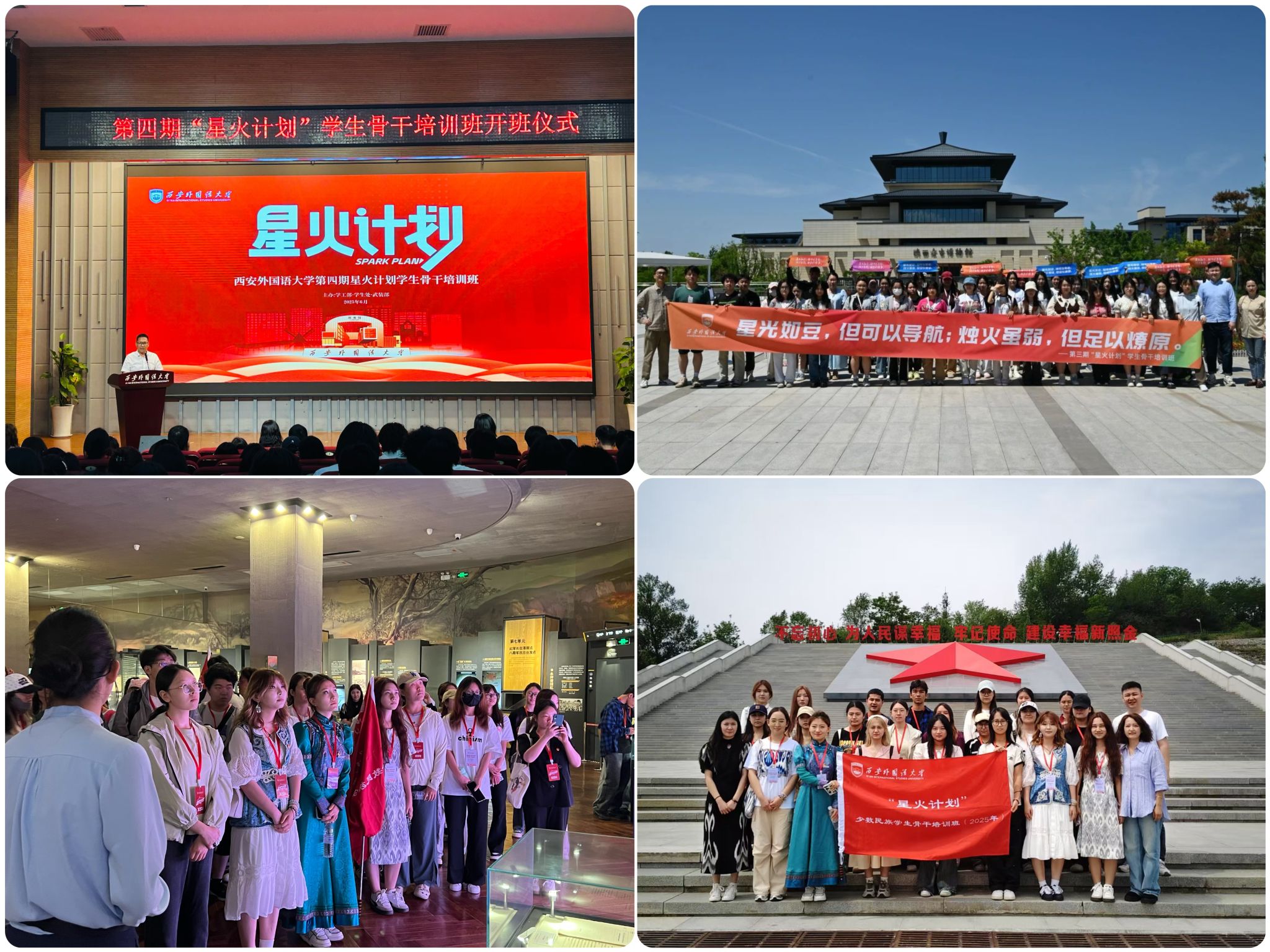 骨干引领,点燃先锋模范的奋进星火。学校高度重视少数民族学生骨干的培养锻造。2025年选拔30名少数民族学生骨干进入校级“星火计划”培训班,开设5场能力提升专题讲座。组织学生骨干队伍赴延安、照金等革命圣地开展实地研学,让学生在追寻红色足迹、感悟革命精神中坚定理想信念,将学习成果转化为服务同学、奉献社会的实际行动,有效发挥了“点亮一盏灯,照亮一大片”的先锋模范作用。