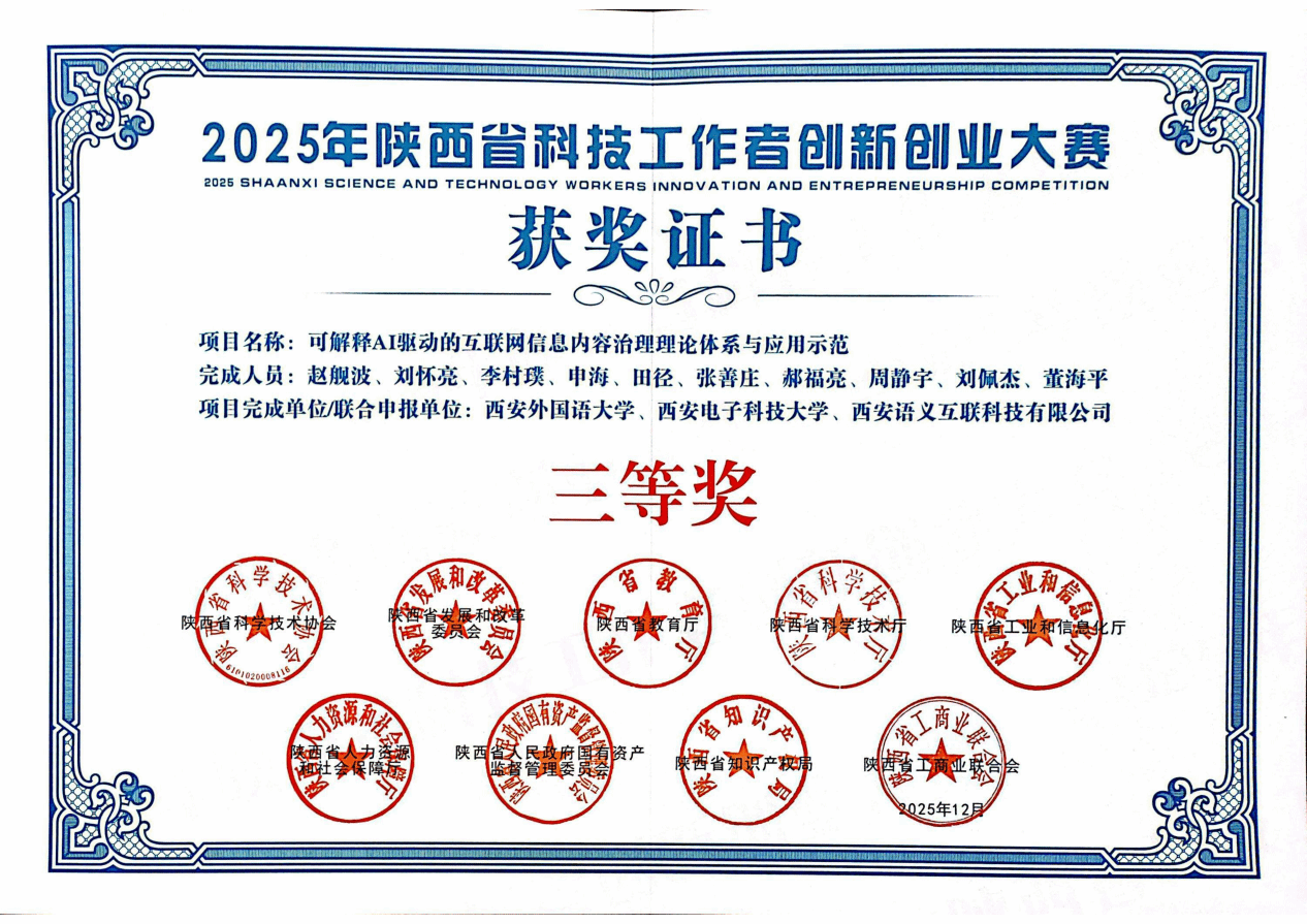 近日,2025年陕西省科技工作者创新创业大赛获奖名单正式公布,我校经济金融学院团队凭借项目“可解释AI驱动的互联网信息内容治理理论体系与应用示范”,在“新一代电子信息与人工智能组”的激烈角逐中脱颖而出,斩获省级三等奖。这是我校首次在该赛事中获奖,实现了赛事奖项零的突破,彰显了我校在跨学科人工智能领域的探索成效与发展潜力。