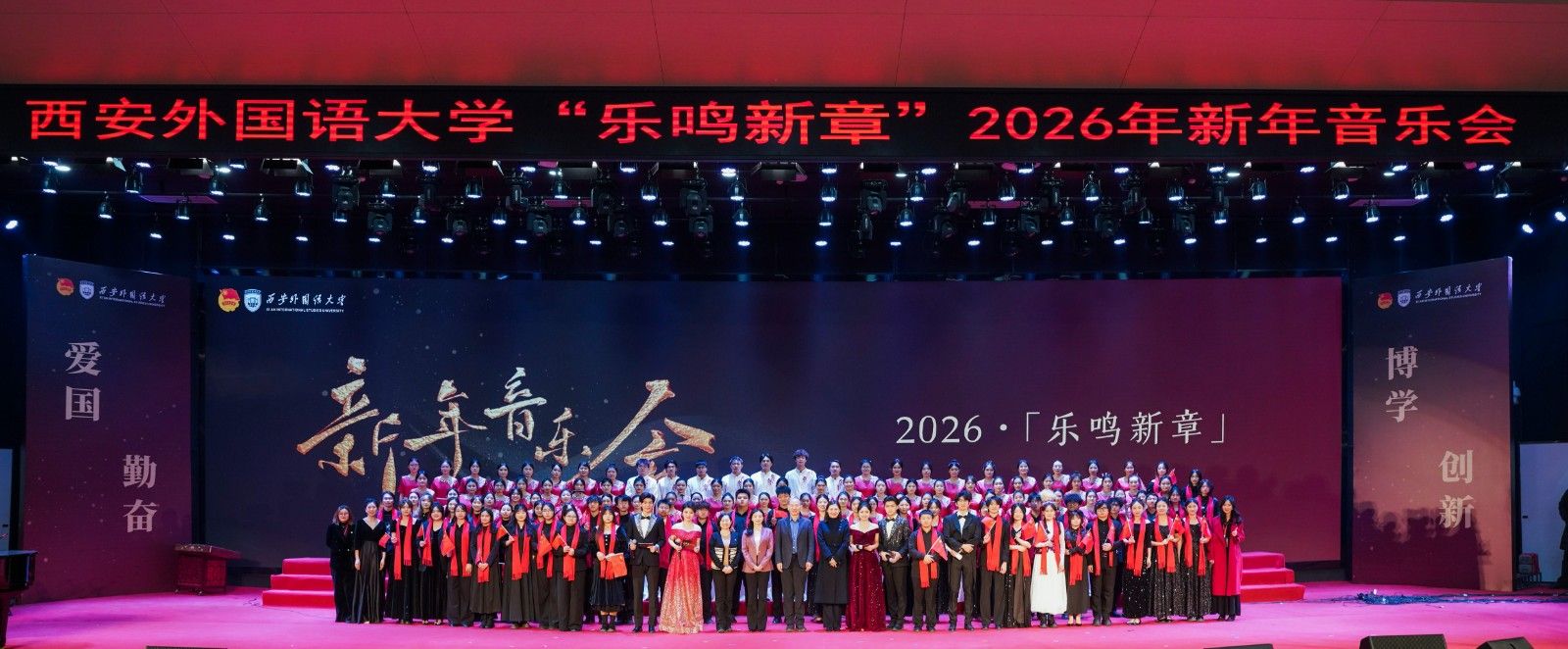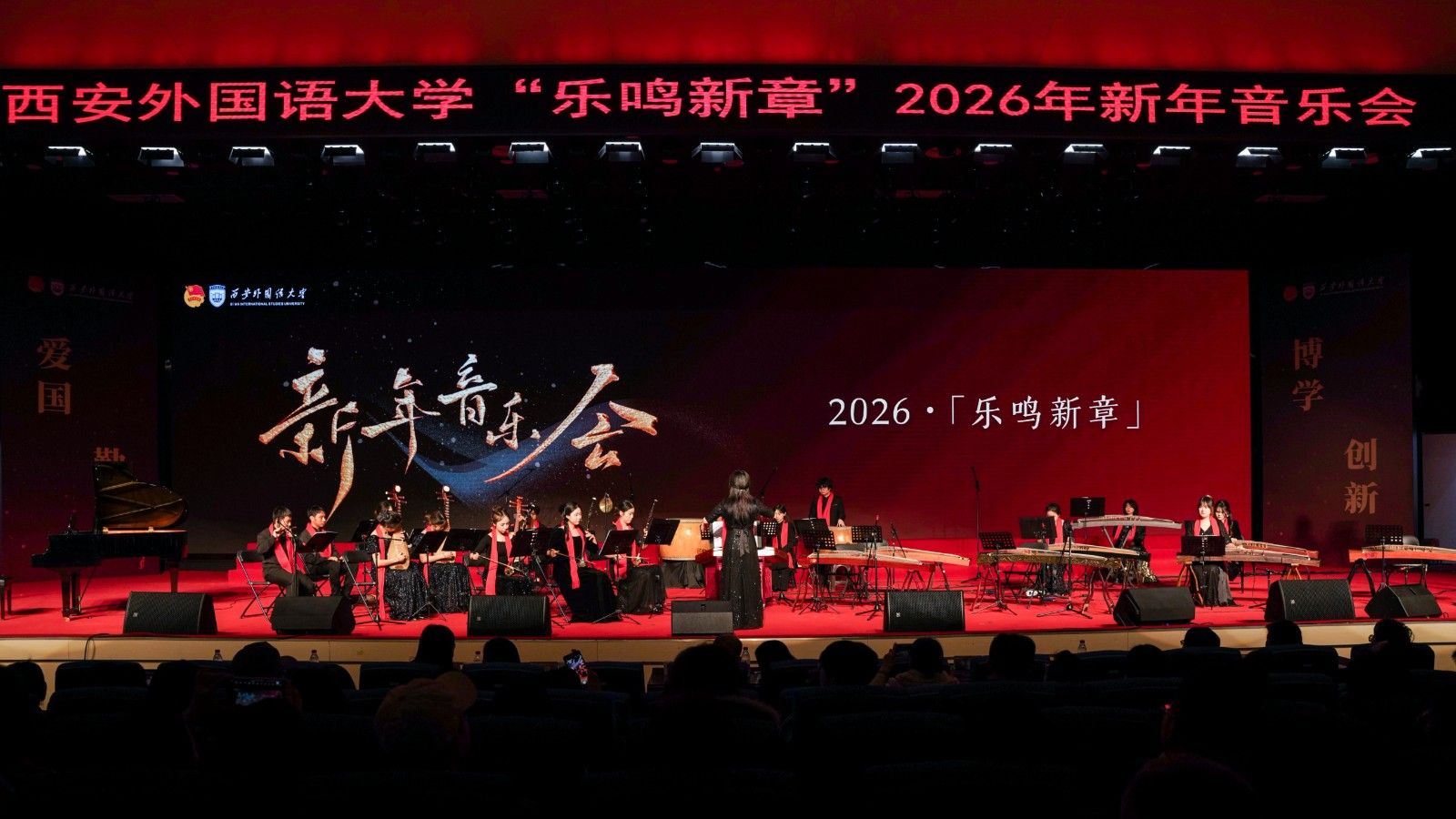 12月30日晚,欢快悠扬的旋律在西安外国语大学2026年新年音乐会现场精彩奏响。本次音乐会以“乐鸣新章”为主题,由我校大学生艺术团学生倾情演绎,用乐声感恩过往、奔赴新程。校党委副书记马洁、副书记王强、副校长李京昊、副校长邓滢,以及相关职能部门、二级学院负责人和师生代表一同欣赏演出。