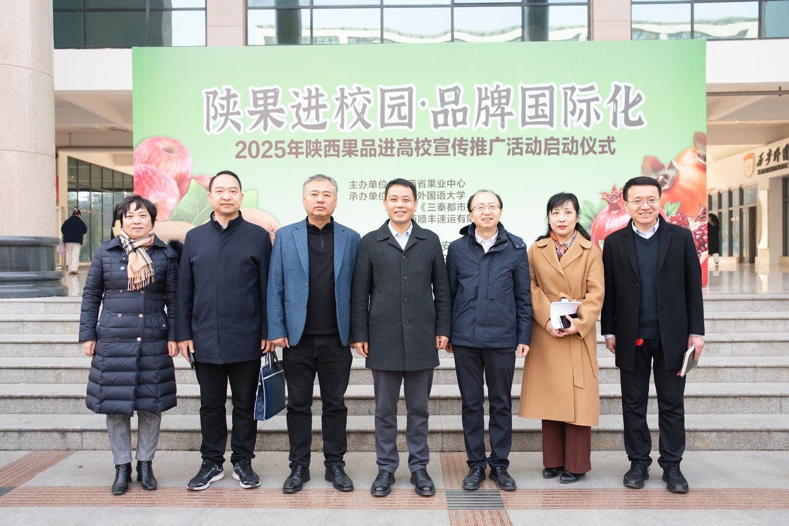 12月30日,2025“陕果进校园·品牌国际化”宣传推广活动在我校长安校区顺利举行。活动由陕西省果业中心主办,西安外国语大学、陕西《三秦都市报》社、陕西顺丰速运有限公司承办,以“政校协同、产教融合”为核心,搭建“校园+产业+育人”三维平台,为陕果品牌国际化与乡村振兴注入高校力量。陕西省果业中心主任赵广柱,我校副校长黄立波,陕西《三秦都市报》社社长王戈等领导嘉宾,30家优质果品企业代表及我校师生共300余人参加活动。