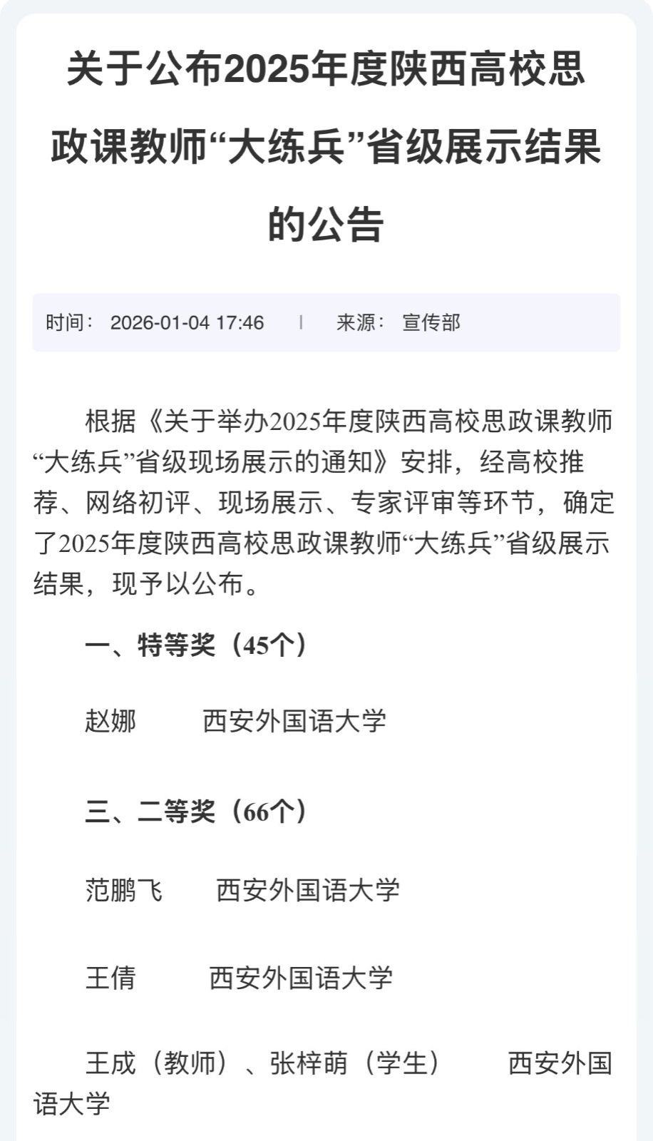 近日,中共陕西省委教育工委、陕西省教育厅公布了2025年度陕西高校思政课教师“大练兵”省级展示结果,经高校推荐、网络初评、现场展示、专家评审等环节,马克思主义学院赵娜老师获得特等奖,范鹏飞老师、王倩老师、以及王成老师和张梓萌同学团队获得二等奖。