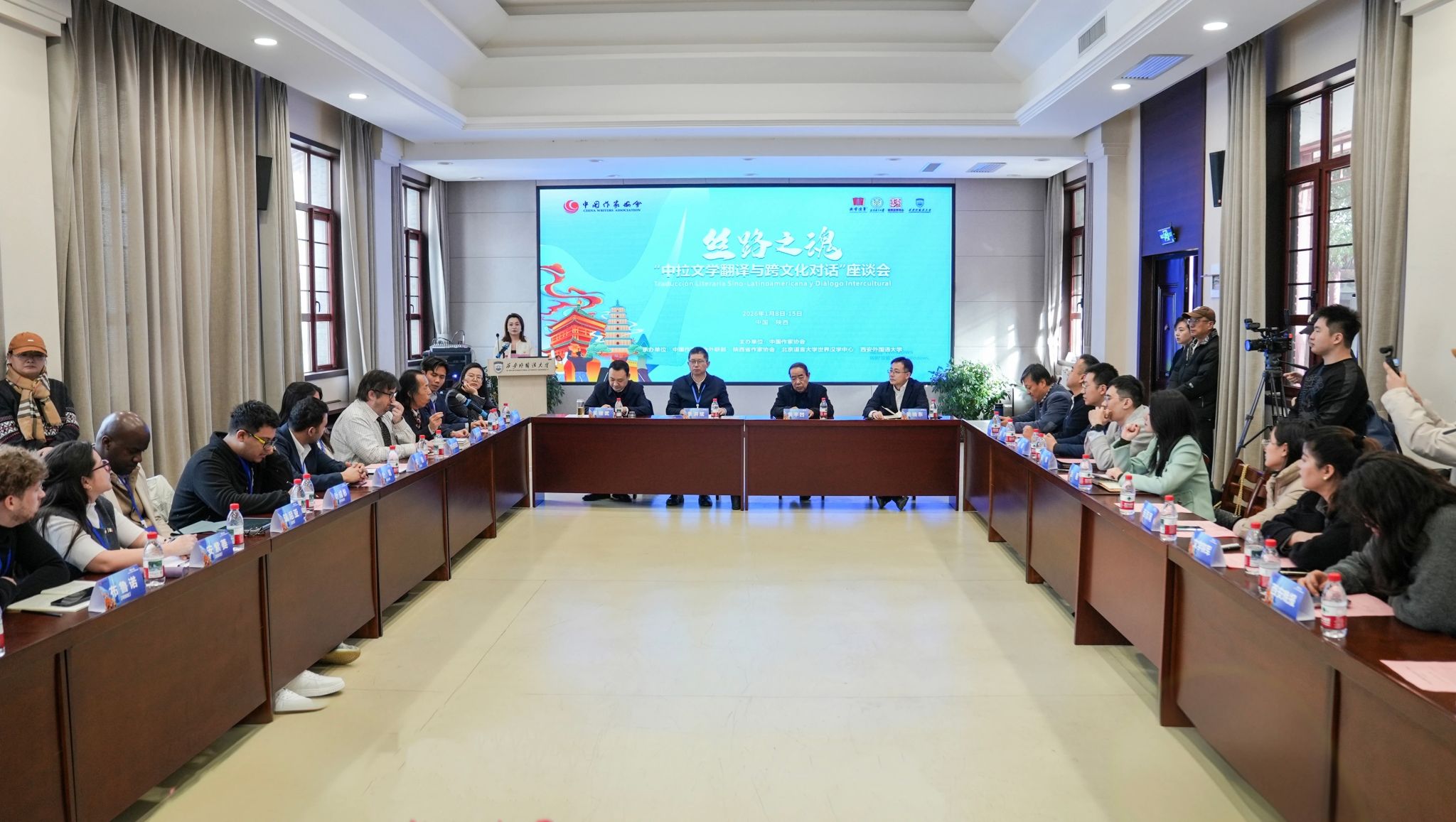 1月14日,由中国作家协会主办,中国作协外联部、陕西省作家协会、北京语言大学世界汉学中心和我校共同承办的“丝路之魂——中拉文学翻译与跨文化对话”座谈会在雁塔校区中华文化体验中心报告厅成功举办。中国作协外联部主任张洪斌,陕西作协主席贾平凹;来自秘鲁等6国的青年翻译家、世界汉学中心专员、陕西翻译协会以及我校专家学者代表共同参会。校长吴耀武受邀出席并主持会议。
