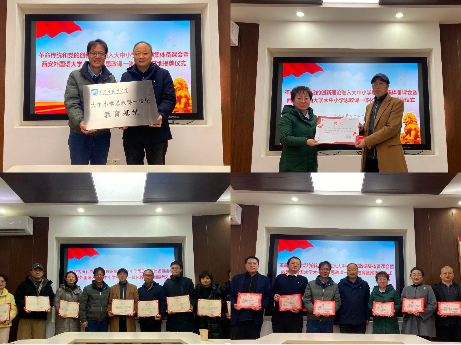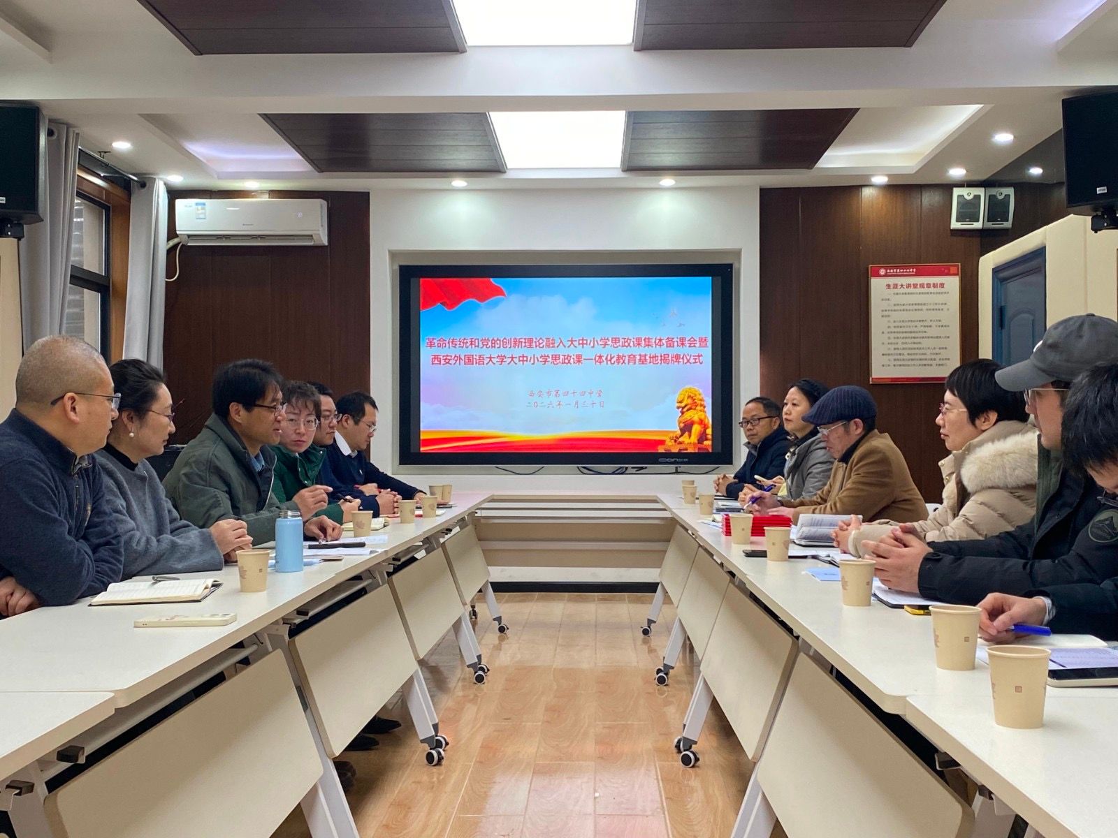 为深入推进大中小学思政课一体化建设,促进革命传统与党的创新理论有机融入各学段思政课教学,2026年1月30日,马克思主义学院、教育学院与西安市第四十四中学共同主办的“革命传统和党的创新理论融入大中小学思政课集体备课会暨西安外国语大学大中小学思政课一体化教育基地揭牌仪式”在四十四中学举行。马克思主义学院党委书记、大中小学思政课一体化研究中心主任刘小勇、教育学院党委副书记刘一静、西安市第四十四中学校长刘瑞聪、西安市第十中学副校长谢婷、陕西省王增运教学名师工作室骨干教师以及我校部分师生参与活动,刘小勇、刘瑞聪、刘一静、谢婷分别致辞,四十四中副校长刘贤主持备课会。