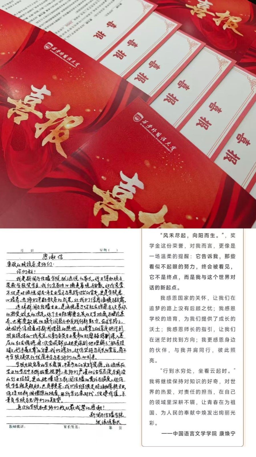 为深入落实资助育人要求,搭建家校协同育人桥梁,凝聚育人合力、激发学生奋进动力,我校连续两年为获奖学生发放喜报,今年共为4798名优秀学子印制发放喜报。假期期间,学工部组织开展“资助育人・喜报送家”走访活动,各二级学院书记、导师、班主任及辅导员深入70余名学生家中,实地走访、面对面交流,传递校园温情,共话学生成长发展。