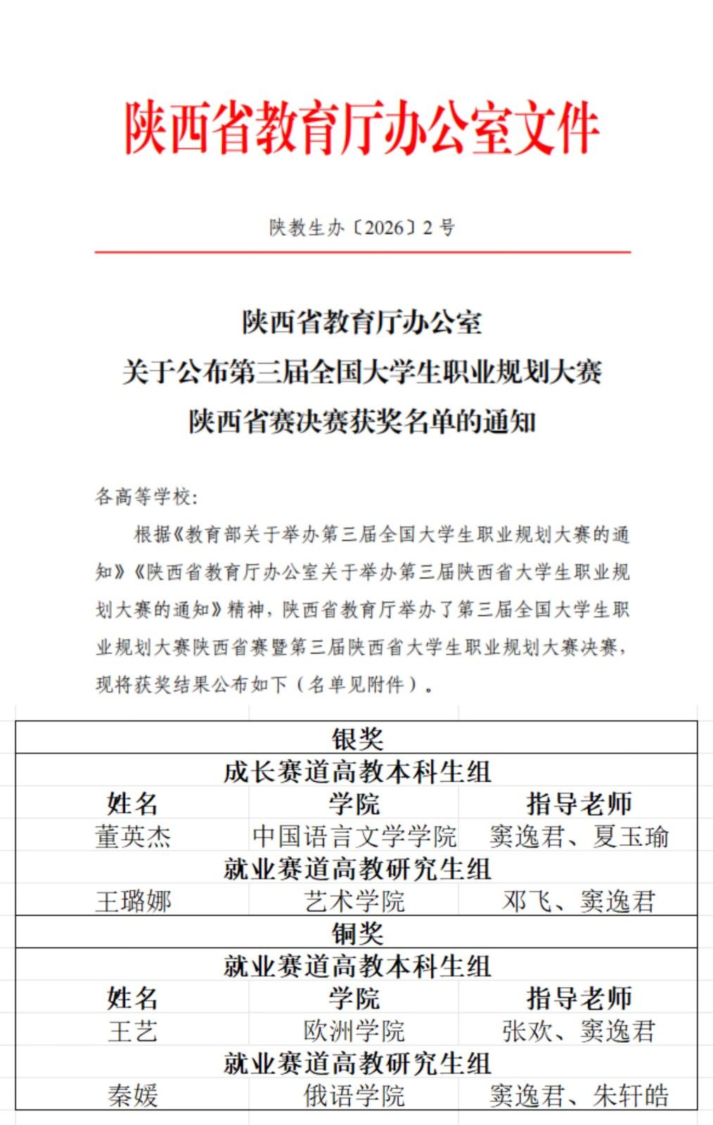 近日,第三届陕西省大学生职业规划大赛省级决赛圆满完成,我校学子凭借扎实的职业规划能力与出色的现场表现,获银奖2项、铜奖2项。
