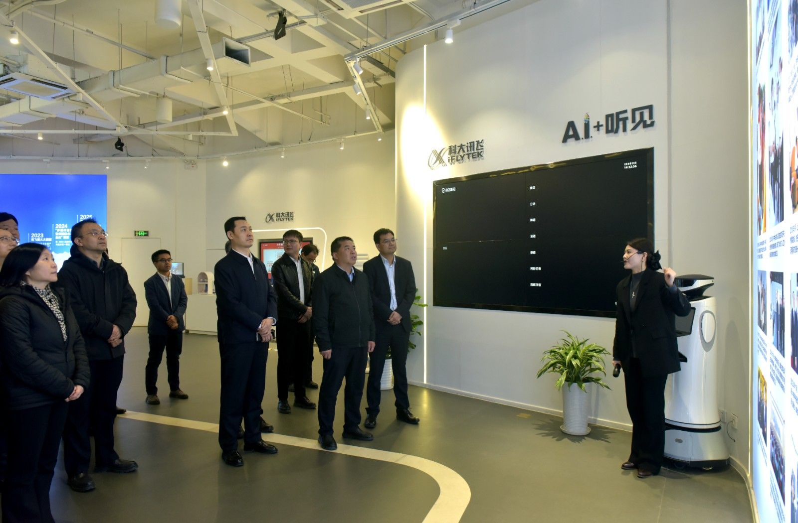 活动中,一行人参观科大讯飞丝路总部展厅,了解智能语音、自然语言处理、机器翻译、智慧教育及讯飞星火认知大模型等核心技术应用,直观感受AI技术在外语教学、跨语言服务、国际化人才培养中的实践成果。