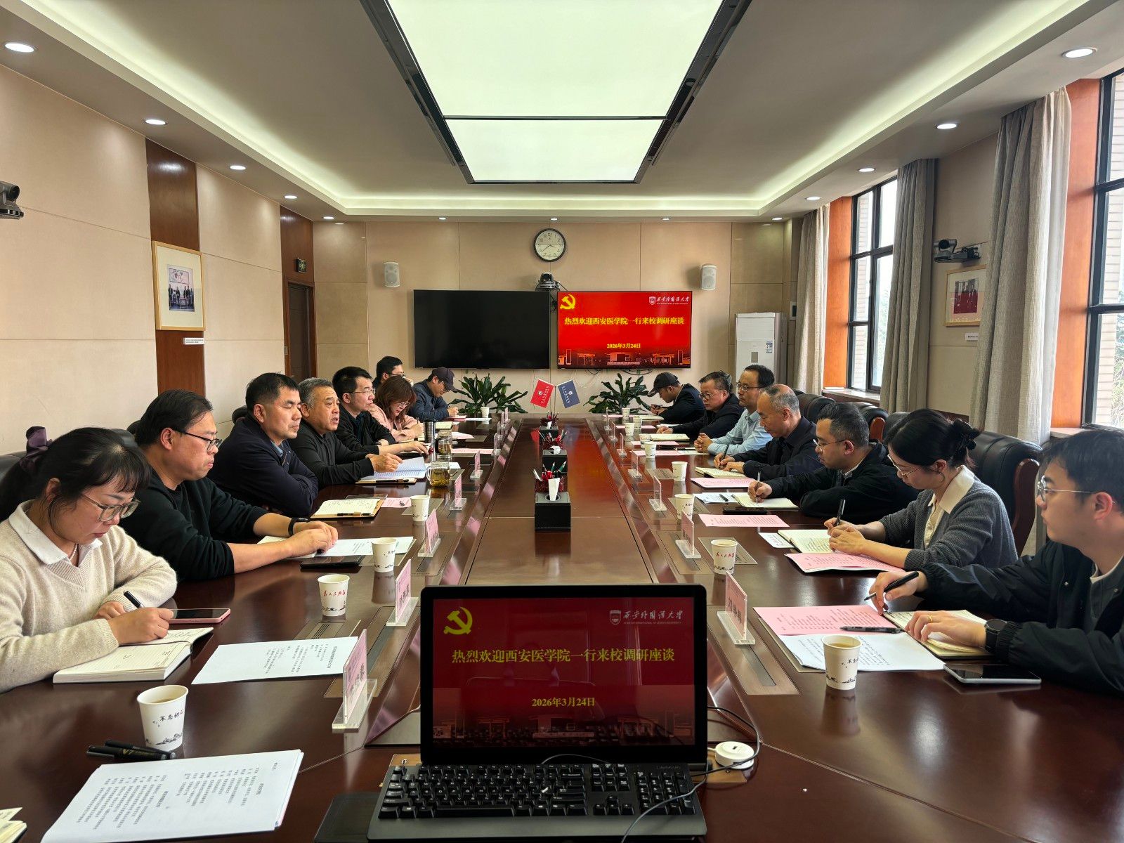 3月24日下午,西安医学院党委副书记、纪委书记、监察专员田民政一行10人来校调研交流纪检监察工作。校党委书记刘振涛对田民政一行的到来表示热烈欢迎,校党委副书记、纪委书记、驻校纪检监察组组长姜劲波出席座谈会并讲话,纪检监察机构、党委巡察办公室全体工作人员参加了会议。
