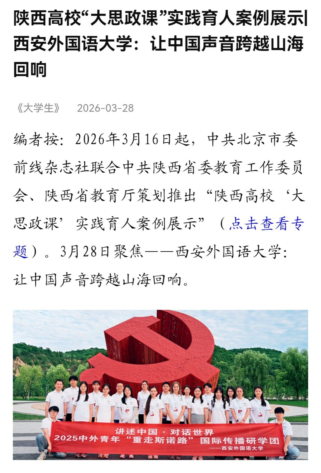 我校实践育人案例《西安外国语大学:让中国声音跨越山海回响》,入选陕西高校“大思政课”实践育人案例展示,展示活动由中共北京市委前线杂志社、中共陕西省委教育工作委员会、陕西省教育厅联合策划。
