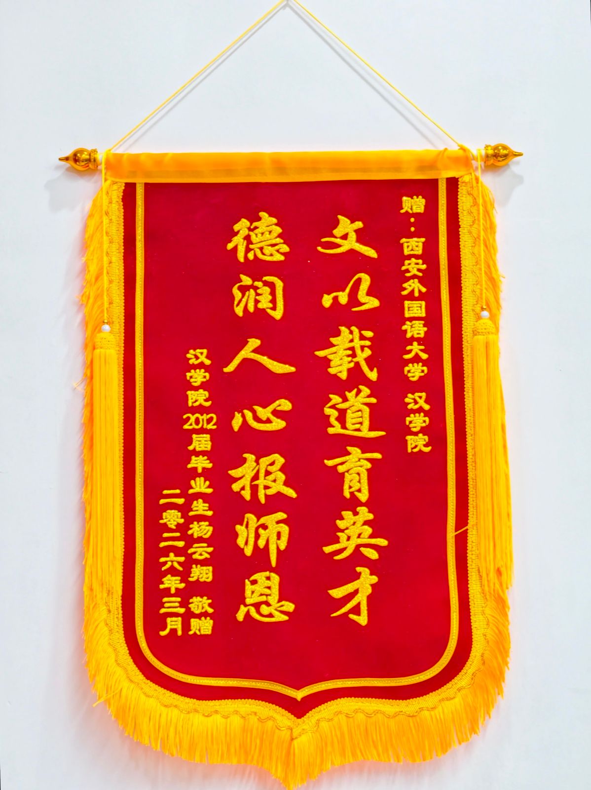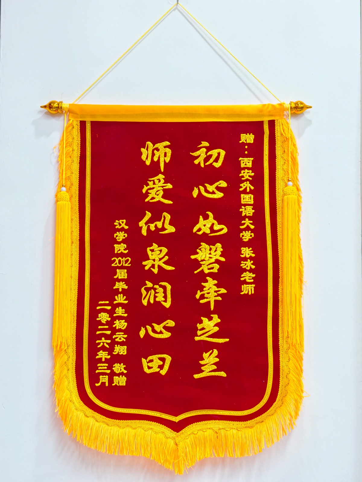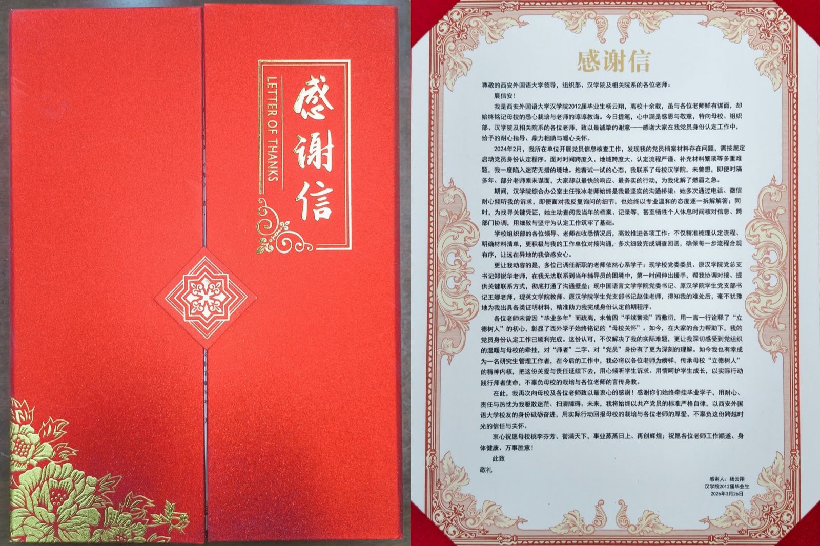近日,我院及研究生辅导员张冰收到2012届毕业生杨云翔送来的锦旗,同时,学校也收到了杨云翔发来的感谢信,对学院及学校相关部门在其党员身份认定工作中给予的暖心帮助致以诚挚谢意,这一暖心事迹正是学院践行正确政绩观、厚植为民服务情怀的生动缩影。