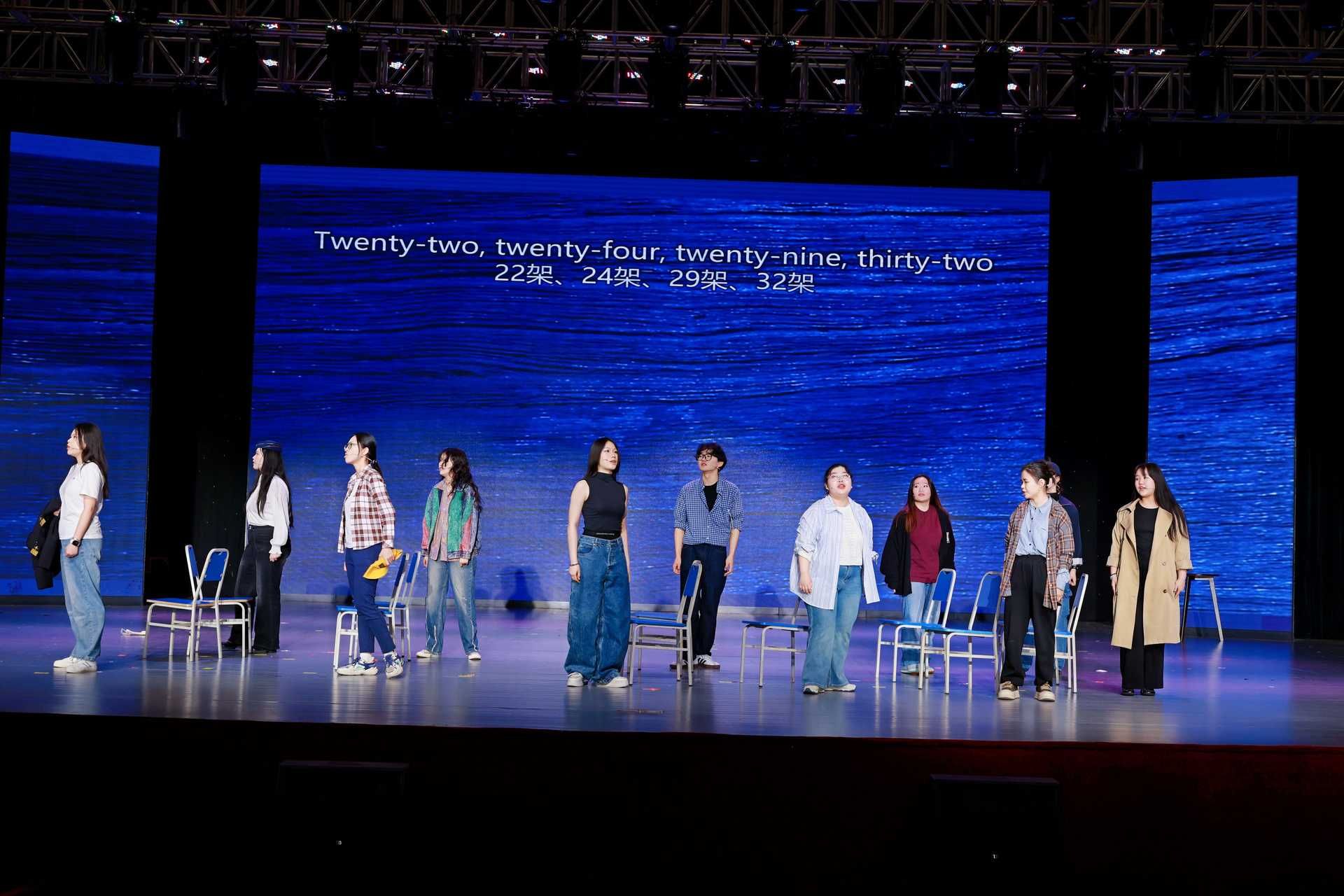 我校参赛剧目选用百老汇经典音乐剧《来自远方》,讲述灾难事件后,七千余名全球旅客滞留加拿大纽芬兰甘德小镇,陌生人以善意互助、温暖相守的感人故事,传递人性光辉与人文力量。该剧目由英文学院牵头,联合新传学院、欧洲学院、高翻学院、中文学院共 11 名学生演员共同演绎,于2025年戏愫音乐剧社年度汇演首演后持续打磨提升,最终在全国赛场脱颖而出。