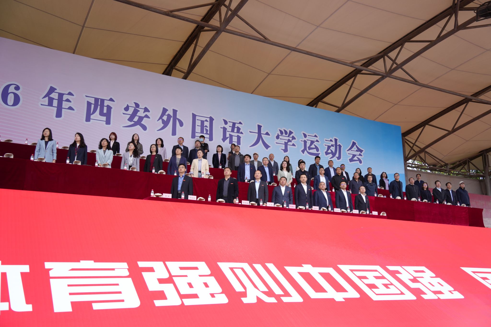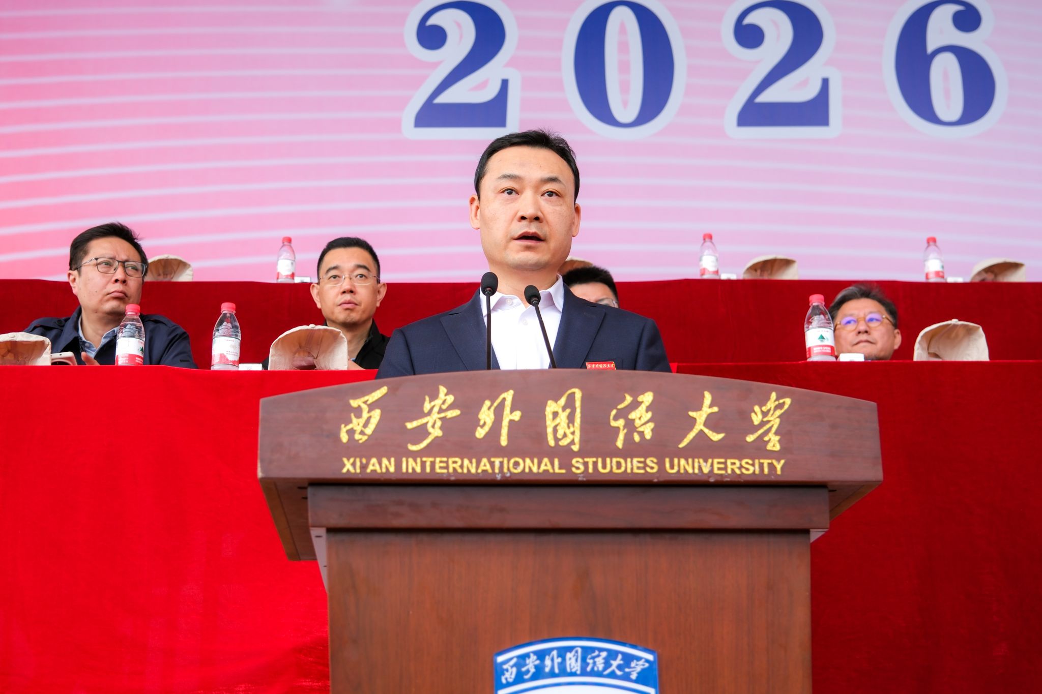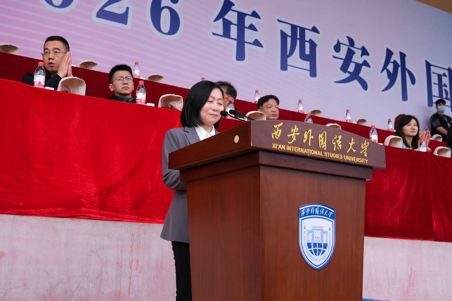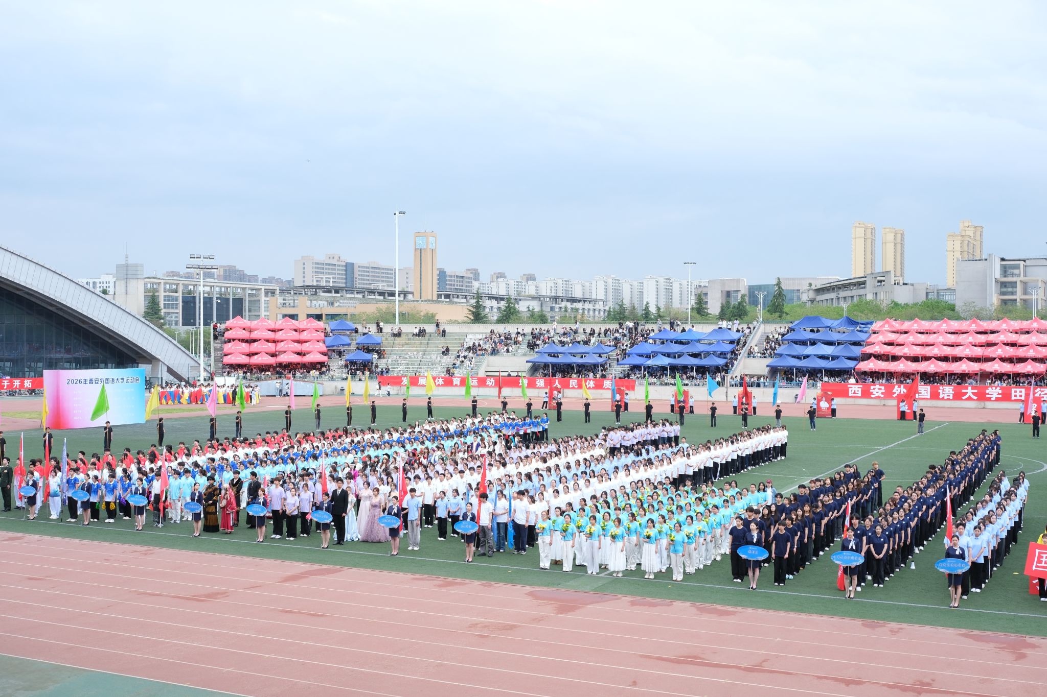 4月16日上午,2026年西安外国语大学运动会在长安校区体育场正式开幕。校党委书记刘振涛,党委副书记、校长吴耀武,全体在家校领导,各部门负责人、各学院党政负责人,各单位、各部门的师生员工参加开幕式。开幕式由副校长邓滢主持。