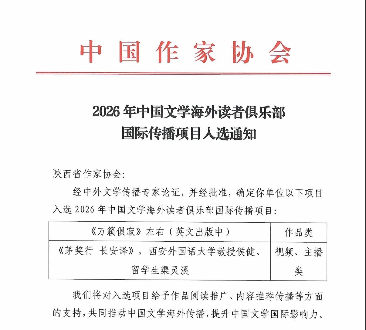 近日,中国作家协会对外联络部正式下发通知,经中外文学传播专家论证并批准,我省2项文学成果、2名国际传播主播成功入选“2026年中国文学海外读者俱乐部国际传播项目”,将获得作品译介推广、内容精准传播等多方面专业支持,助力陕西文学借力国家级平台“走出去”,进一步提升国际影响力。其中,由我校西班牙语侯健副教授和古巴留学生渠灵溪申报的《茅奖行 长安译》获批“视频、主播类”项目立项。中国作家协会表示,将对入选项目给予重点支持,通过整合海内外传播资源,推动作品在海外读者俱乐部的精准推广与传播,进一步扩大中国文学的国际覆盖面和影响力。